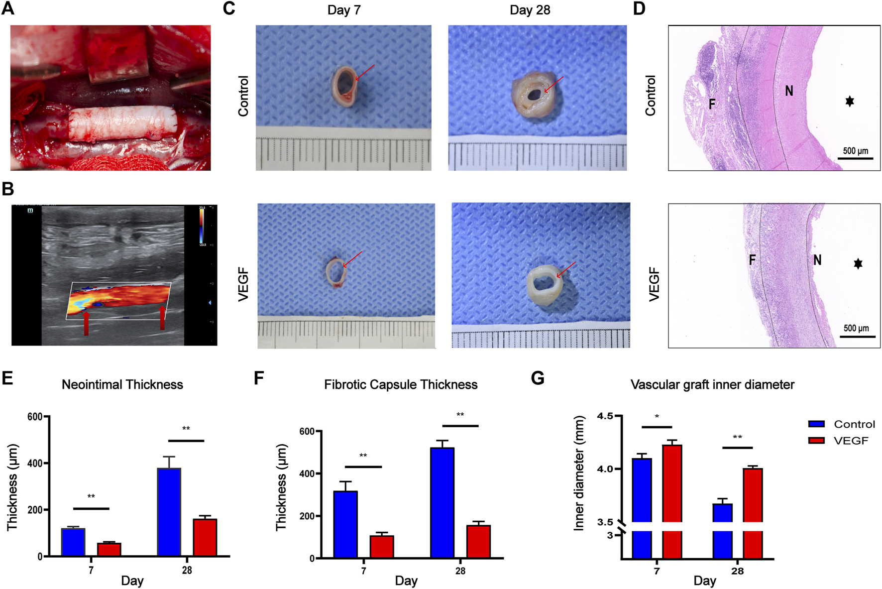 Macroscopic images of the rabbit abdominal artery implantation model (A). Color Doppler ultrasound images of vascular grafts post-implantation. Red arrows depict the anastomosis (B). Gross images of vascular grafts at days 7 and 28 in each group. Red arrows depict the neointima of vascular grafts (C). HE staining of vascular grafts at day 28 in each group. F, fibrous capsule. N, neointima.