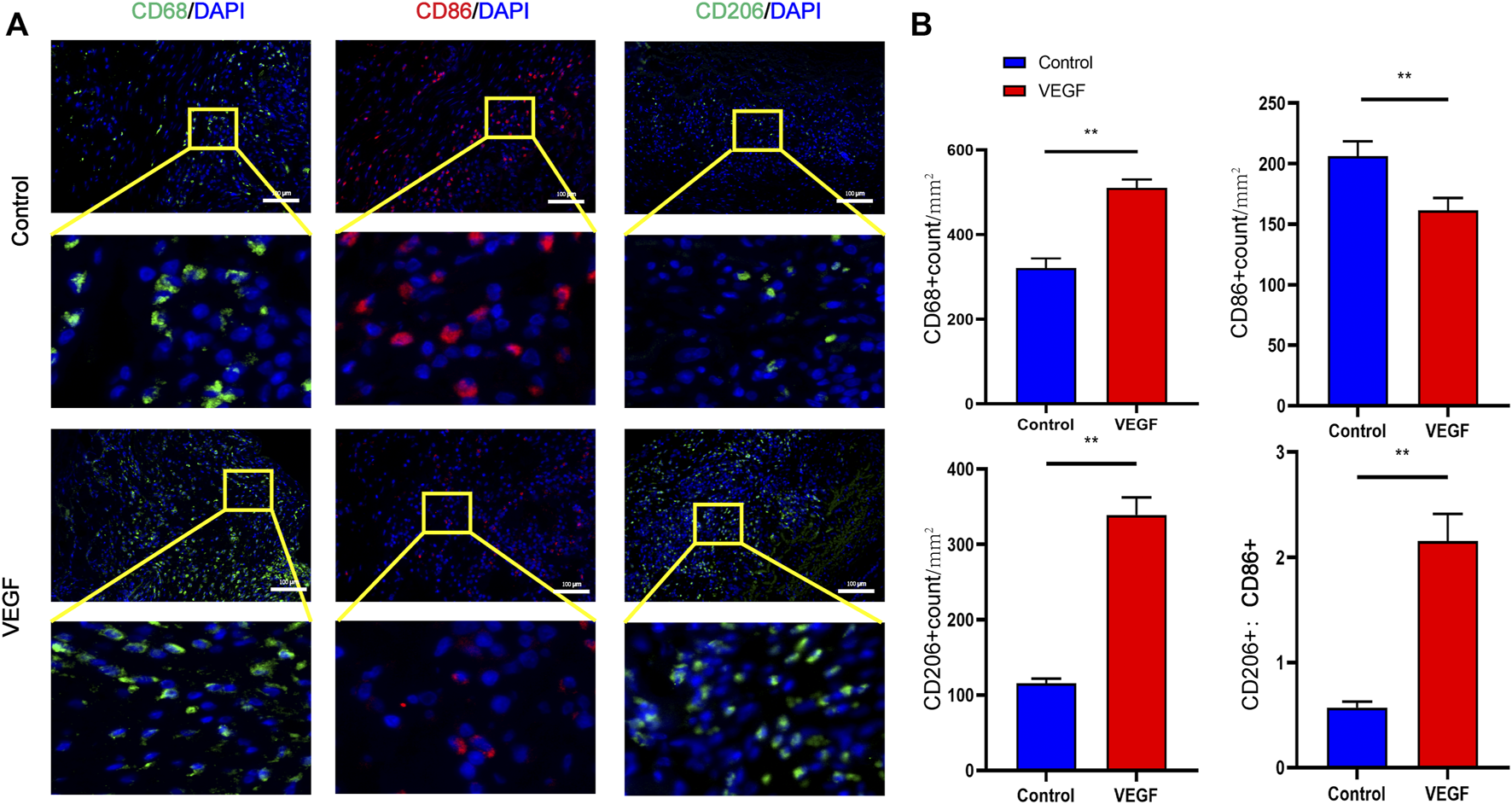 Vascular endothelial growth factor (VEGF) is a key player in angiogenesis and is therefore widely used to stimulate endothelialization of vascular grafts (Zhang et al., 2013; Koobatian et al., 2016; Kong et al., 2019). Recently, Wheeler et al. found that both endogenous decidual VEGF and exogenous recombinant VEGF could stimulate macrophage migration and polarization towards the M2 phenotype in HTP-1 cell culture (Wheeler et al., 2018). Smith et al. found that in VEGF-containing grafts, infiltrating monocytes transformed into anti-inflammatory M2 phenotype macrophages and the grafts formed a well-defined lumen and medial layer similar to those of natural arteries. VEGF creates an anti-inflammatory microenvironment that promotes regeneration of decellularized vascular grafts (Smith et al., 2019). Therefore, we hypothesized that VEGF may attenuates neointimal hyperplasia in vascular grafts by inducing macrophage polarization towards M2 phenotype and modulating local inflammatory responses.