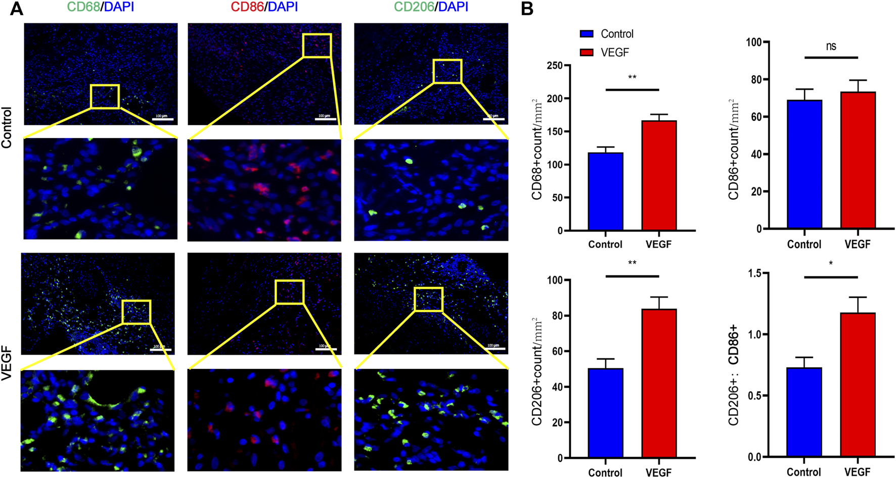 The New Zealand rabbit subcutaneous implantation model was used to assess the in vivo function of rhVEGF-165 (Figure 5A), which was then further assessed in the vascular environment. Both on visual inspection and HE staining, we observed that the fibrous capsule was thinner in the VEGF group than in the control group (Figures 5B, C). The fibrotic capsule thickness of the control group increased over time from 286.15 ± 39.64 μm at day 7 to 528.88 ± 66.01 μm at day 28 (Figure 5D). In contrast, the fibrous capsule thickness of the VEGF group was reduced at all time points compared with the control group (Figure 5D). Immunostaining markers of total macrophage (CD68), M1 (CD86), and M2 (CD206) phenotypes were used to assess macrophage response. The VEGF group had a higher density of CD206-positive cells at days 7 and 28 compared to the control group (Day 7,21.41 ± 0.57 count/mm2 vs. 18.79 ± 1.14 count/mm2, p < 0.05; Day 28, 296.06 ± 13.29 count/mm2 vs. 170.61 ± 6.70 count/mm2, p < 0.01) and also exhibited an increased M2/M1 macrophage ratio (Day 7,0.99 ± 0.06 vs. 0.81 ± 0.02, p < 0.05; Day 28, 1.37 ± 0.04 vs. 0.51 ± 0.04, p < 0.01), indicating a predominant M2 phenotype on the implant. In contrast, the control group had a lower density of CD206-positive cells than the VEGF group and a reduced M2/M1 macrophage ratio. These results can be observed in the representative images (Figures 6A, B).
