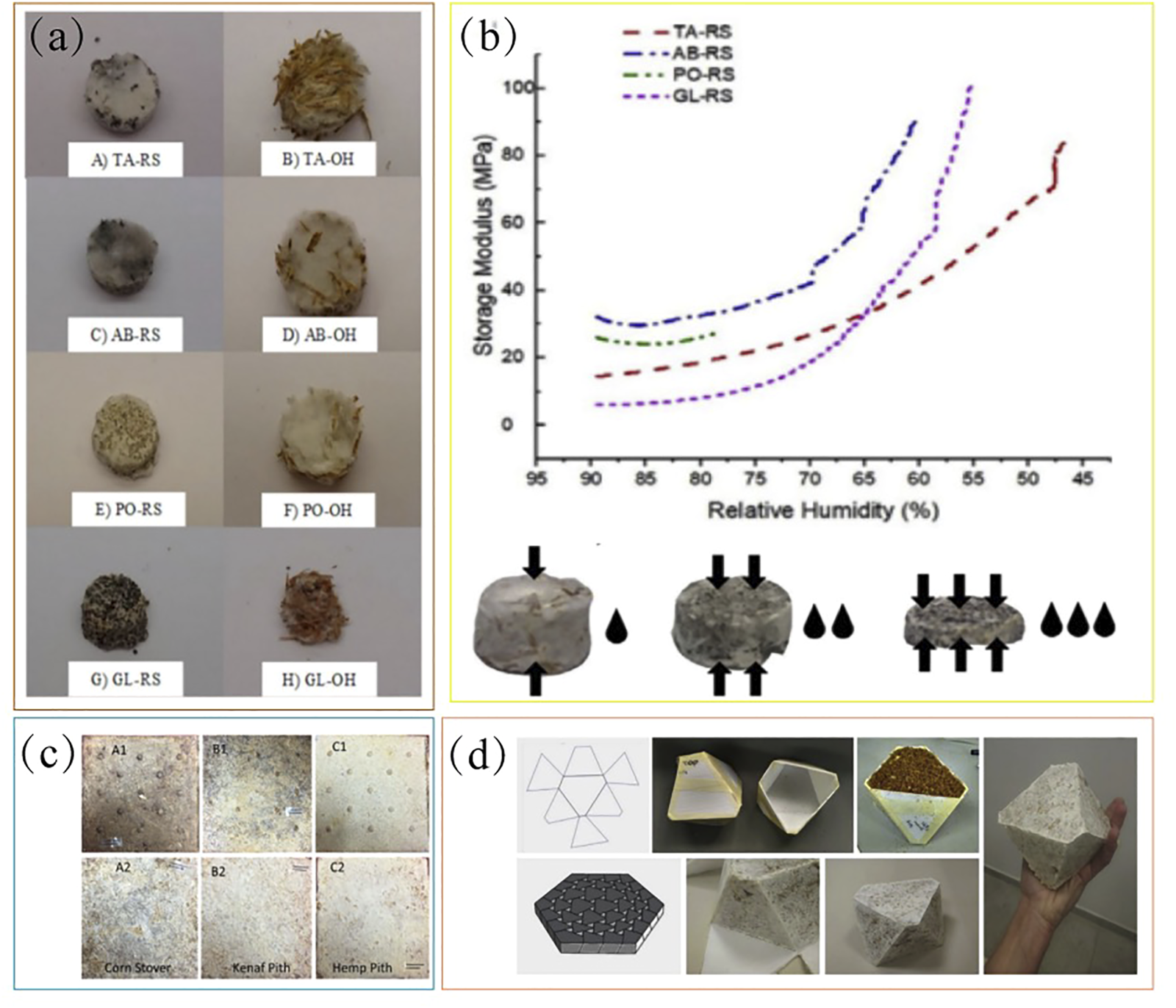 (A) Development of moisture-resistant composites based on different matrices (Trichoderma asperellum (TA) grown on A) rapeseed cake (RS) and B) oat husks (OH) as substrates; Agaricus bisporus (AB) grown on C) RS and D) OH; Pleurotus ostreatus (PO) grown on E) RS and F) OH; Ganoderma lucidum (GL) grown on G) RS and H) OH), (B) their dynamic moisture monitoring and schematic diagram of material changes (Tacer-Caba et al., 2020), (C) development of termite-resistant composite bio-boards (Bajwa et al., 2017), (D) specific models constructed based on CAD design and innovative molds (Attias et al., 2020).