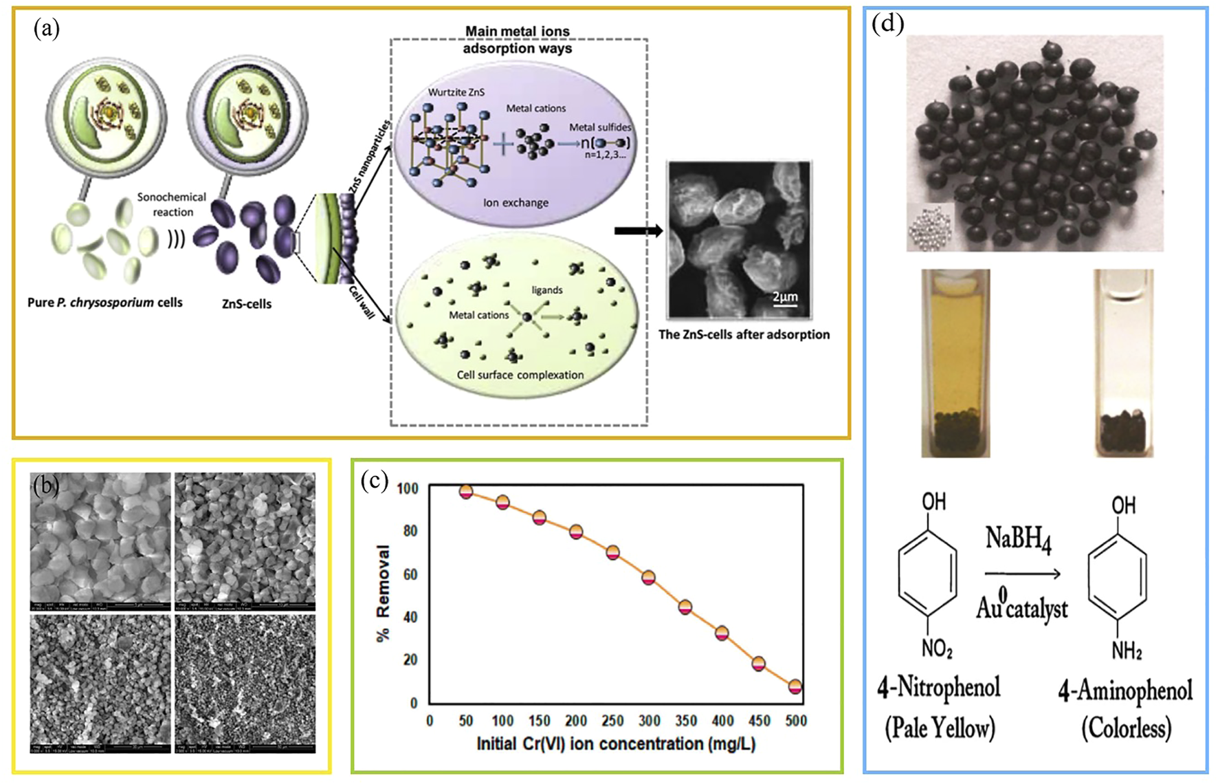 (A) High-performance adsorption of Pb2+ and Cd2+ by ZnS nanoparticle layer (Qin et al., 2020), (B) synthesis of magnetic nanoparticles coated mixed fungal biomass (MNP-FB), (C) adsorption of Cr(VI) ions (Saravanan et al., 2021), (D) nanocomposite biomass synthesis of materials and their heterogeneous catalysis to enable the recovery of AuNPs catalysts: schematic representation after catalytic adsorption (Narayanan and Sakthivel, 2011).
