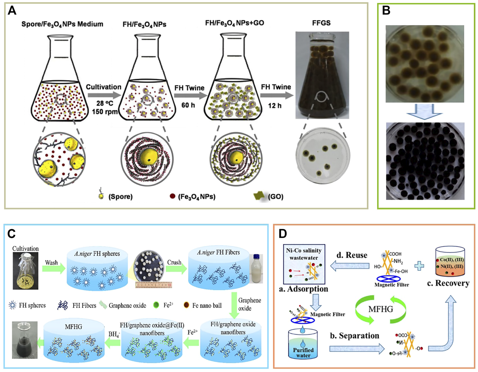 (A) Synthesis of layered core-shell structured fungus hyphae (FH)/Fe3O4/graphene oxide (GO) nanocomposite spheres (FFGS), (B) removal and recovery of methyl violet (MV) and uranium (U) (after 72 h) (Zhu et al., 2019), (C) preparation of three-dimensional magnetic fungal hyphal/graphene oxide nanofibers (MFHG), (D) capture and adsorption of metal ions Co (II) and Ni (II) (Li et al., 2019).
