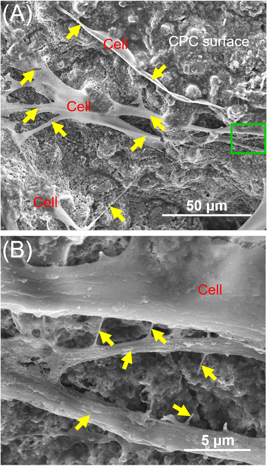 Typical SEM images of CPC scaffolds cultured with PDLSCs for 14 days. The image in (B) is a higher magnification of the green dotted frame in (A). Yellow arrows indicate a healthy cell spreading morphology.