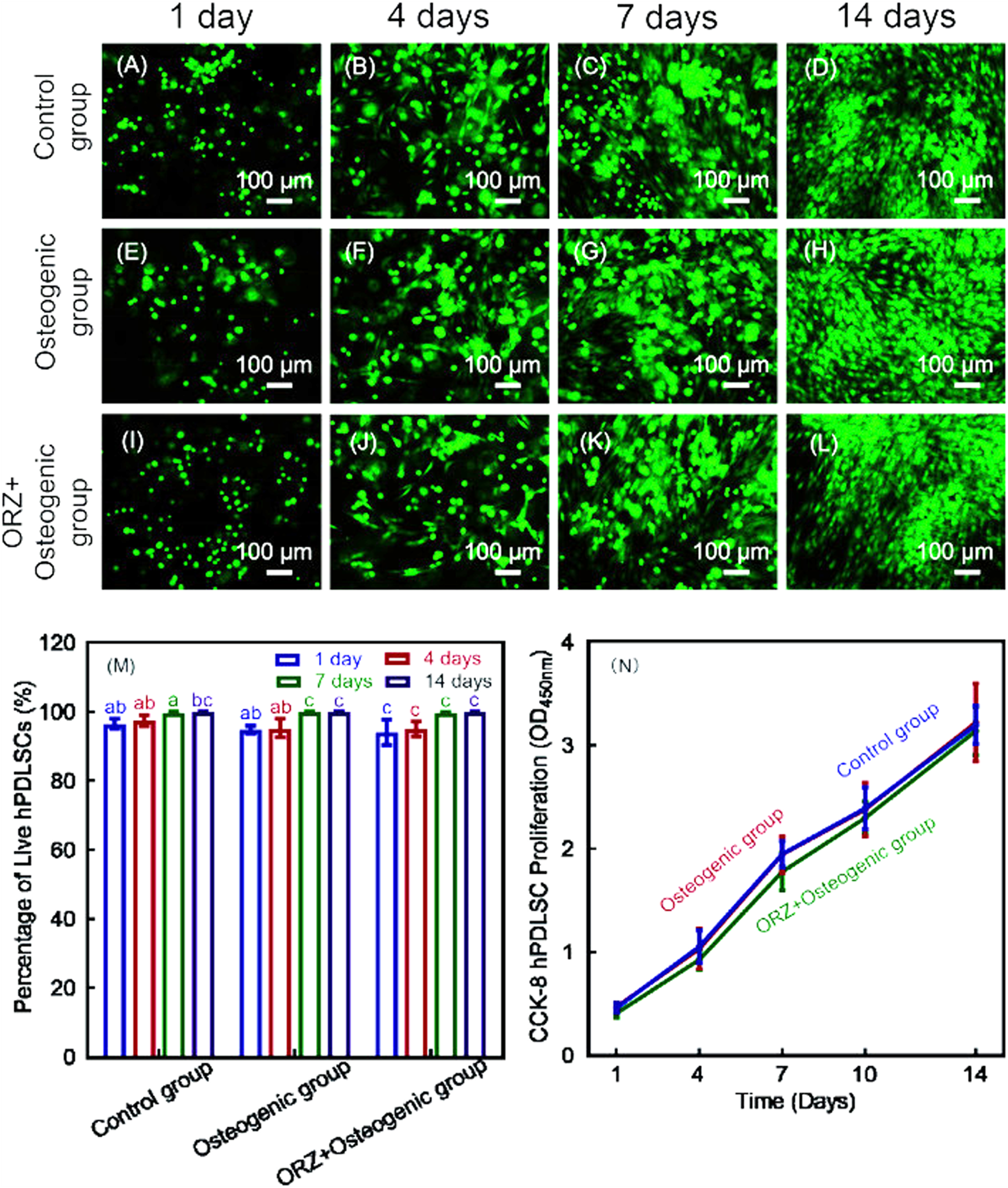 Live/dead images of PDLSCs encapsulated in alginate microbeads in CPC-chitosan scaffolds (A–L). Live cells (green) were numerous and dead cells (red) were very few. Percentages of live cells (M) and CCK-8 from 1 to 14 days showed good cell viability and proliferation, and cell viability (N). Values with dissimilar letters are significantly different from each other (p < 0.05).