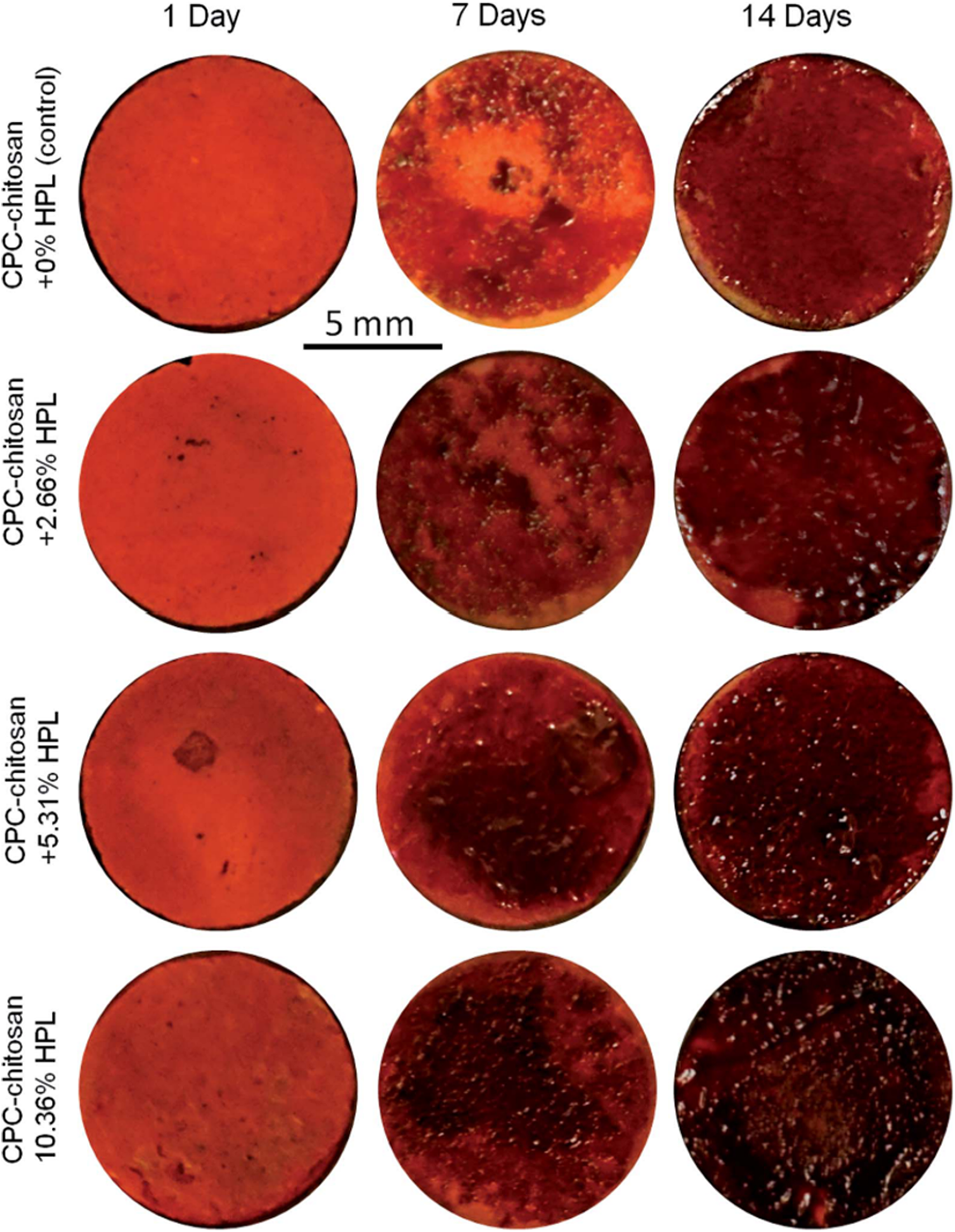 Representative alizarin red staining images of bone mineral synthesis by PDLSCs on CPC. The red staining for the HPL groups was deeper and denser that without HPL at 7 and 14 days, as the mineralization was enhanced by incorporating PL into CPC.