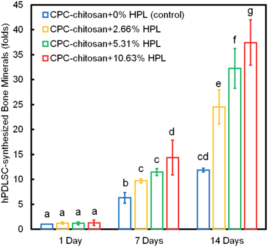 PDLSC synthesis of bone minerals. The HPL groups accumulated more minerals than that at 0% HPL. Values with dissimilar letters are significantly different from each other (p < 0.05).
