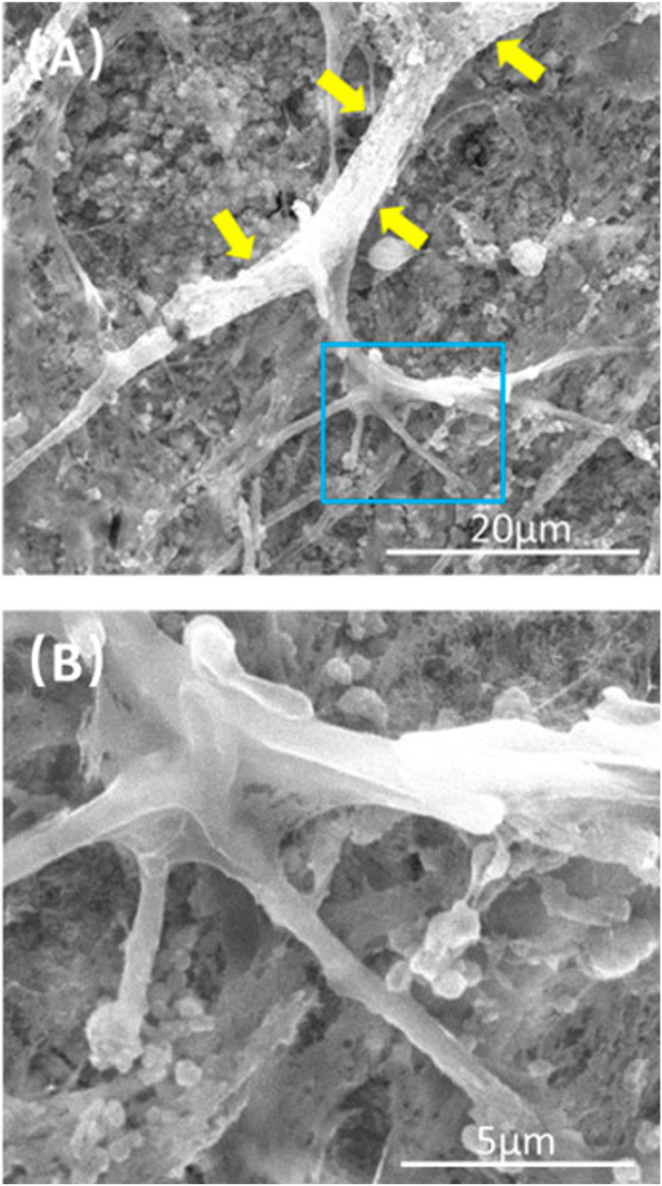 Representative SEM images of CPC scaffolds at 21 days. (B) Is a higher magnification image of the blue dotted frame in (A). Capillary-like structures can be observed on the surface of CPC scaffolds (yellow arrows), and some branch-like stretches were found.