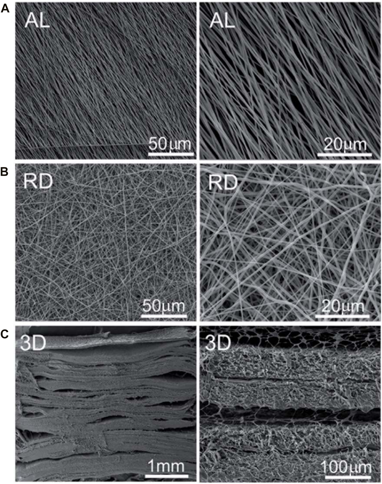 SEM photographs of 2D and 3D scaffold. (A) Surface topographies of aligned (AL) nanofibre. (B) Surface topographies of random (RD) nanofibre. (C) Transversal image of 3D scaffold.