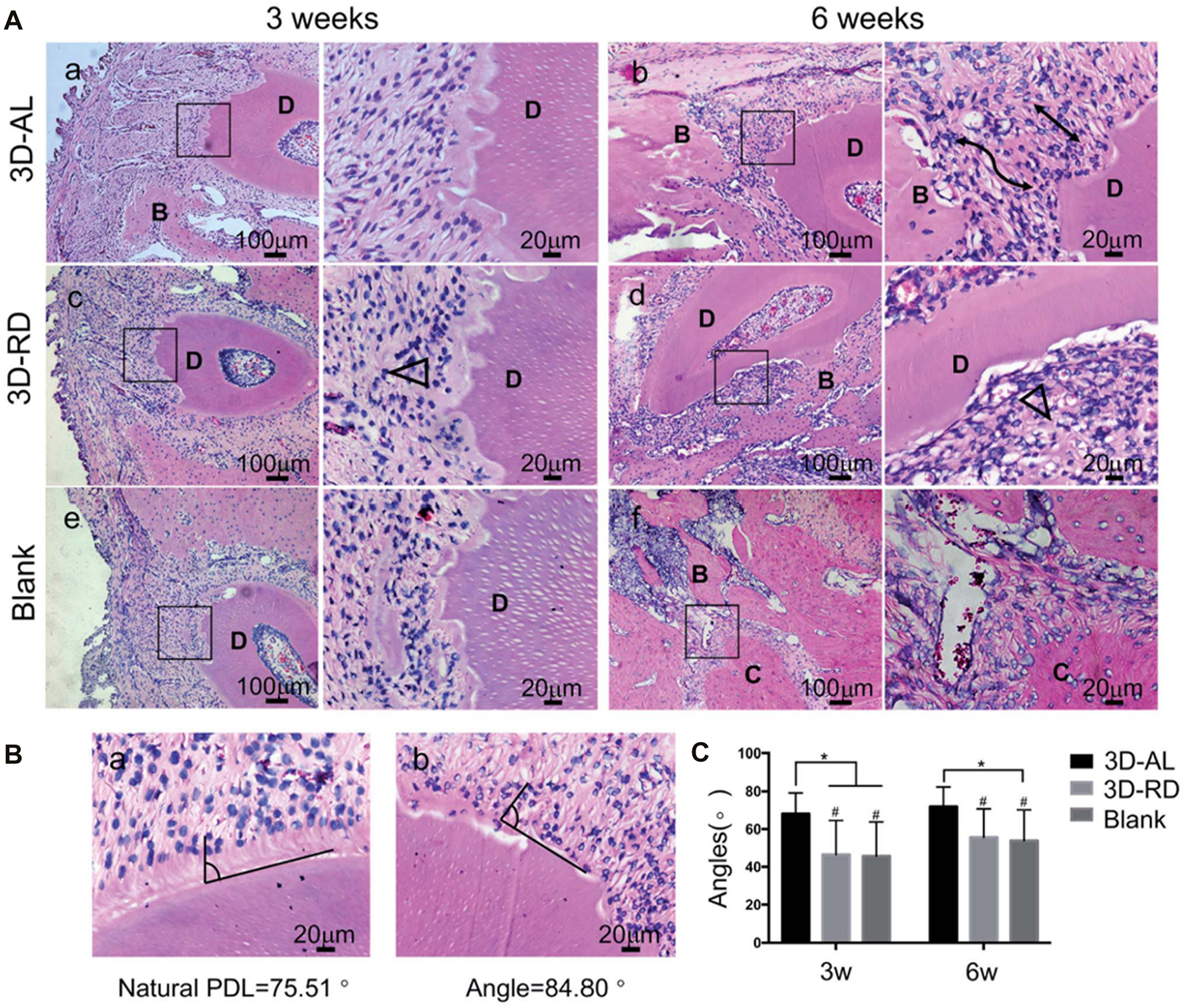 Evaluation of arrangement of regenerated ligament tissue. (A) Hematoxylin and eosin (H and E) staining of 3D-AL 3D-RD and blank control group at 3 and 6 weeks. The images on the right are higher magnifications of images in the black frames on the left. Black lines indicated well aligned regenerated PDL-like tissue. Black triangle represented random and irregular ligament orientation. “D” denoted “dentin,” “B” denoted “bone,” “C” denoted “cementum.” (B) Statistical analysis of angular distribution of regenerated PDL-like tissue in different groups. *On the top of indicated statistical significance between groups (p < 0.05). # On the top suggested statistical difference (p < 0.01) in comparison to natural PDL.