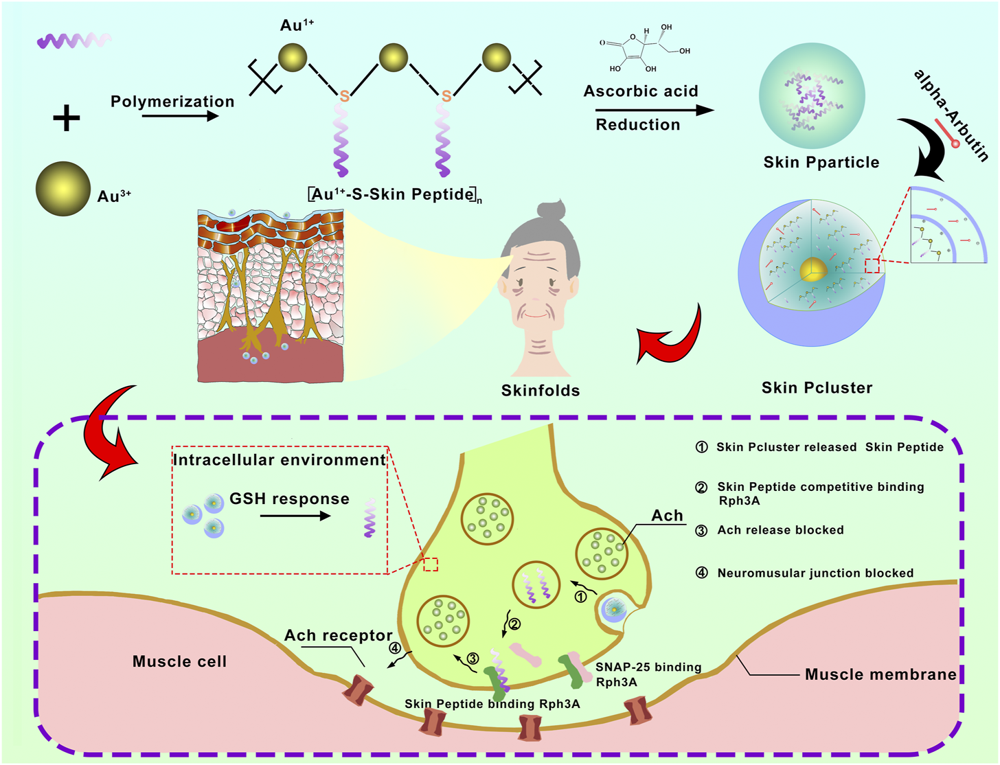 The schematic diagram for synthesis and biological function of Skin Pcluster. Firstly, a bionic peptide called Skin peptide was designed and synthesized. Then, the bioavailable peptide-gold spherical nano-hybrid, Skin Pcluster, was synthesized by self-assembled nanoengineering strategy. Skin Pcluster, similar to botulinum toxin and acetylhexapeptide-8, competitively binded Rph3A to inhibit the release of acetylcholine and then reduce wrinkles caused by excessive contraction of muscle.