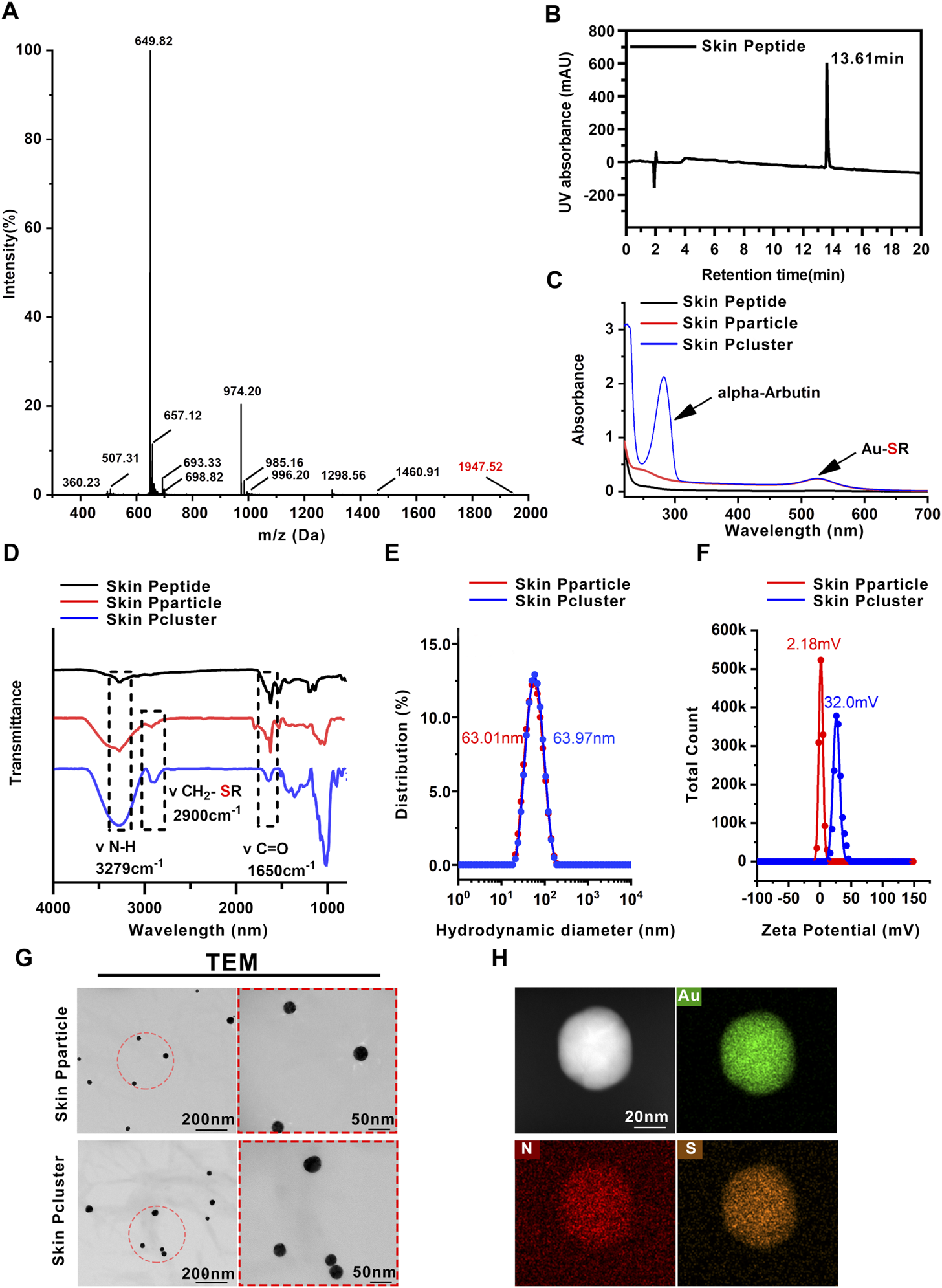 Characterization of Skin Pcluster. (A) The molecular weight of the Skin Peptide was identified by electrospray ionization mass spectrometry. (B) Retention time and purity of Skin Peptide was quantitatively analyzed by high performance liquid chromatography (HPLC) on a C18 column at 214 nm. (C) UV-vis spectra of Skin Peptide, Skin Pparticle and Skin Pcluster. The characteristic absorption peaks of Au-SR and alpha-Arbutin (aromatic compound) were visualized at 520 nm and 283nm, respectively. (D) FTIR spectra of the Skin Peptide, Skin Pparticle and Skin Pcluster were determined after lyophilization. Three absorption peaks at 3279 cm−1, 2900 cm−1 and 1650 cm−1 demonstrated the stretching vibration of N-H, CH2-SR, and C=O, respectively. (E) Hydrodynamic diameter distributions of the Skin Pparticle and Skin Pcluster were performed by dynamic light scattering. (F) The surface charge (Zeta potential) of the Skin Pparticle and Skin Pcluster was measured in PBS at pH7.4. (G) TEM images of the Skin Pparticle and Skin Pcluster were obtained by a CCD camera. The red circles represent magnification-related regions of the Skin Pparticle and Skin Pcluster. (H) Elemental analysis of Skin Pcluster was recorded by HRTEM.