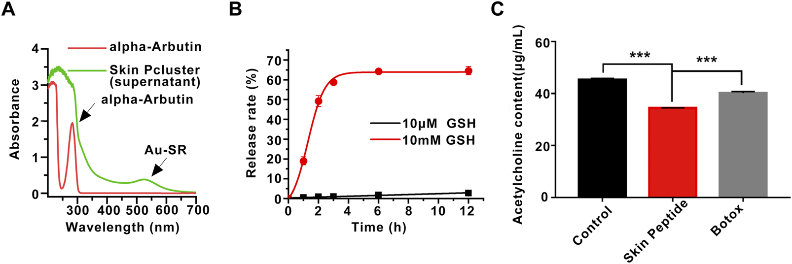 Stability of Skin Pcluster and the release of acetylcholine induced by Skin Peptide. (A) The release of alpha-Arbutin from Skin Pcluster in the supernatant was determined by UV-vis spectroscopy. (B) The release of Skin Peptide was detected in PBS containing 10 μM or 10 mM GSH at different times. (C) The measurement of acetylcholine in the supernatant. Data were shown as mean ± sem (n = 3). P values were obtained by t-test.