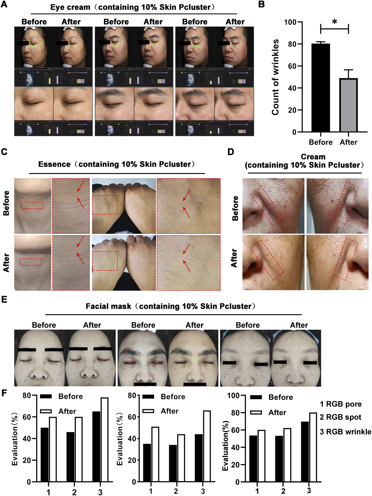 The experiments involving human were approved by the Air Force Medical University Ethics committee. Healthy subjects were recruited and randomly assigned to the group with/without anti-wrinkles treatment. The eye cream, face cream, essence and mask containing 10% Skin Pcluster were used on the skin of eyes, face, hands and neck respectively. The eye cream, face cream and essence were used twice a day and mask were used twice a week for 4 weeks. Pre- and post-treatment images were acquired by VISIA.