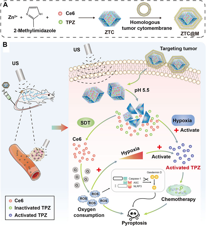 Figure 1. (A) Illustration of the synthetic procedure for ZTC@M nanoparticles. (B) Schematic diagram of the therapeutic mechanism of pH-sensitive US-triggered hypoxia-activated SDT combined chemo-therapy.