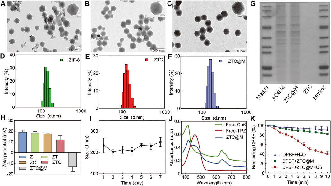 Figure 2. Characterization of ZTC@M nanoparticles. TEM and magnification images of ZIF-8 (A), ZTC (B), and ZTC@M (C). The scale bar is 200 nm. Hydrated nanoparticle size distribution of ZIF-8 (D), ZTC (E), and ZTC@M (F). Gel electrophoresis of AGS cytomembrane and ZTC@M (G). Zeta potential of different nanoparticles (H). The change of hydrated nanoparticle size of ZTC@M (I). The ultraviolet-visible absorption spectra of free-Ce6, free-TPZ, and ZTC@M (J). Reactive oxygen species (ROS) production by ZTC@M under different conditions (K).