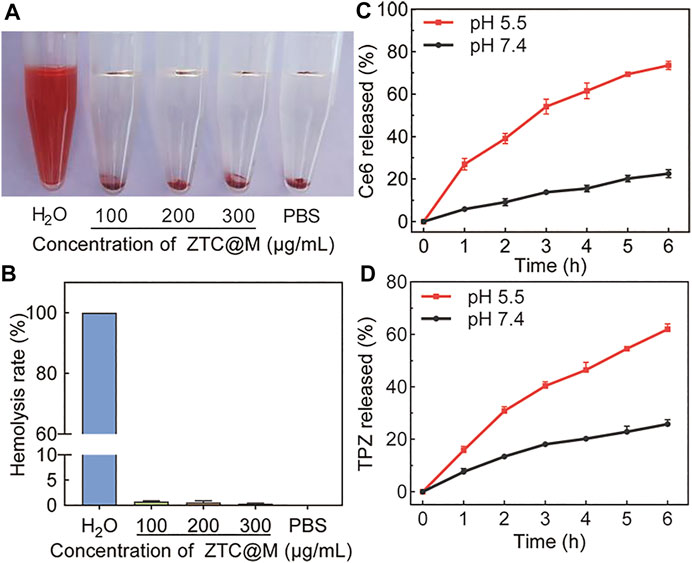 Figure 3. Hemolysis assay of ZTC@M at different concentrations (A) and hemolysis ratio of red blood (B). Ce6 (C) and TPZ (D) controlled release curves of ZTC@M at different pH.