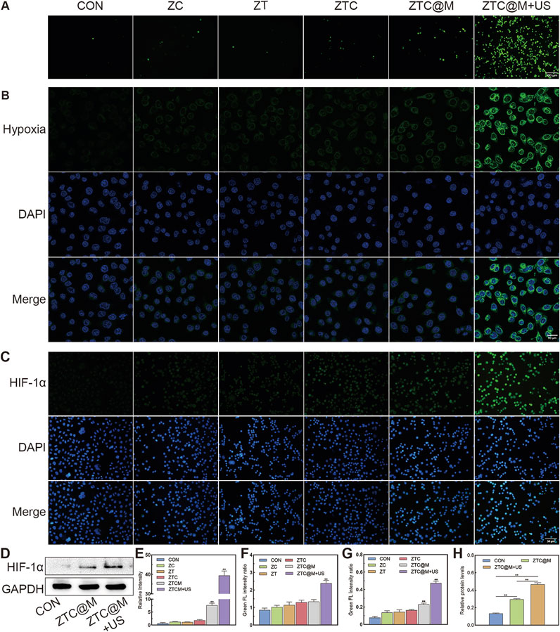 Figure 5. In vitro ROS/hypoxia assay and IF. ROS production was detected by fluorescence of DCFH-DA in AGS cells (A) (100×). Intracellular hypoxia imaging using Image-iT™ Green Hypoxia Reagent as the syndicator (B) (200×). Immunofluorescence images of AGS stained by HIF-1α (C) (200×). Gel images of HIF-1α in AGS cells treated with ZTC@M + US (D). Quantification of intracellular fluorescence intensity in A (E), B (F), and C (G). The bar chart indicates the relative density of HIF-1α to GAPDH in D (H). *p < 0.05, **p < 0.0001.