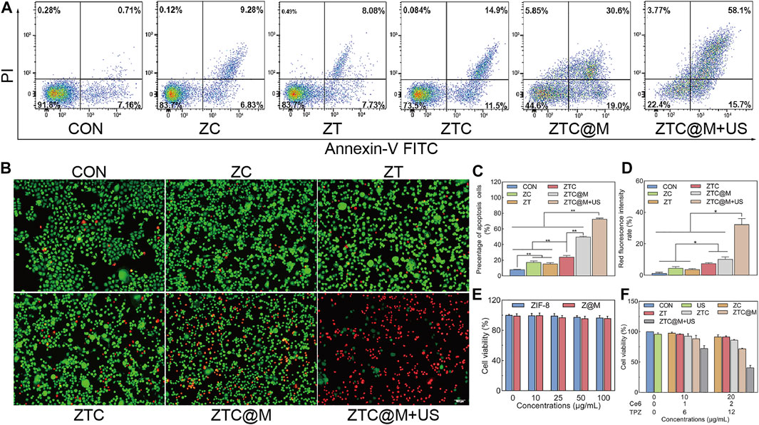 To evaluate the killing effect of nanoparticles, CCK-8 assay, apoptosis assay, and Calcein/PI staining were conducted. The apoptosis assay presented that the percentages of apoptotic cells in CON, ZC, ZT, ZTC, ZTC@M, and ZTC@M + US groups were approximately 8.13%, 17.40%, 15.49%, 24.10%, 49.87%, and 72.77%, respectively (Figures 6A,C). There was a significant difference observed between ZTC and ZT/ZC. A higher rate of apoptosis was observed in ZTC@M compared to that of the ZTC. The highest apoptosis rate was demonstrated in the group treated with US (ZTC@M + US).