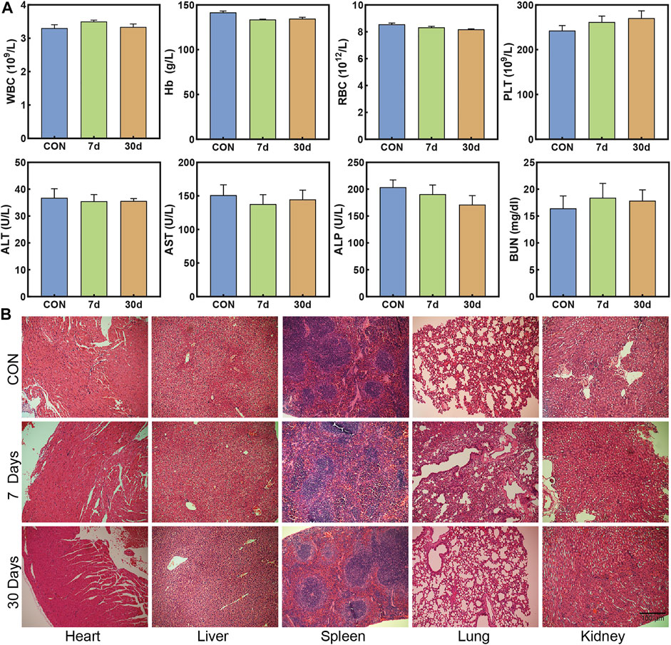 Figure 7. In vivo biocompatibility research. The count changes of WBC, RBC, Hb, PLT, ALT, AST, ALP, and BUN (A). H&E staining of nude mice after 7 days and 30 days of three injections of ZTC@M (B) (100×).