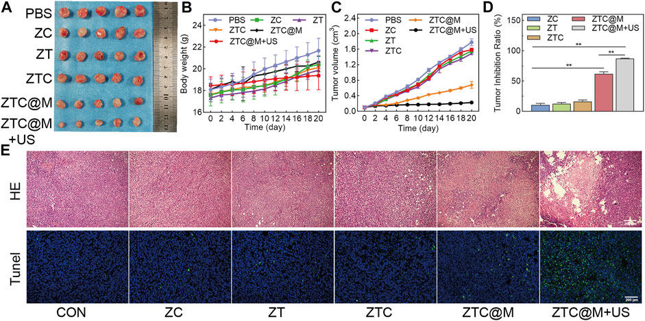 Furthermore, H&E staining of the tumor was performed to evaluate the therapeutic efficacy. An obvious necrotic tissue was observed in the tumor tissues treated with the ZTC@M + US group (Figure 8E). Furthermore, the TUNEL staining was performed to observe the tumor injury in mice among the different groups (Figure 8E). The results indicated that there was a small number of apoptotic cells observed in the tumors of PBS, ZC, ZT, and ZTC groups. In the ZTC@M group, many apoptotic cells were seen, but the number was less than that of the ZTC@M + US group. These results were in accord with the results of H&E staining.