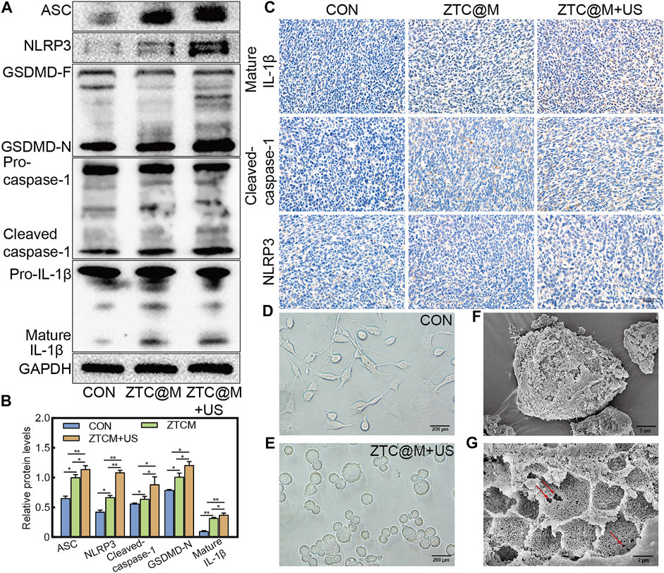 Figure 9. ZTC@M + US activates morphological and molecular characteristics of pyroptosis. The protein levels of cleaved-caspase-1, ASC, GSDMD-N, mature IL-1β, and NLRP3 after SDT (A). The bar chart indicates the relative density of cleaved-caspase-1, ASC, GSDMD-N, mature IL-1β, and NLRP3 to GAPDH in A (B). IHC staining of cleaved-caspase-1, mature IL-1β, and NLRP3 of tumor (C). Phase-contrast photomicrographs showing AGS cells untreated (D) and treated with ZTC@M + US (E) (100×). Scanning electron micrographs of AGS cells after treatment with ZTC@M + US (F) and (G). Scale bars are 5 µm (E) and 2 µm (F). *p < 0.05, **p < 0.0001.