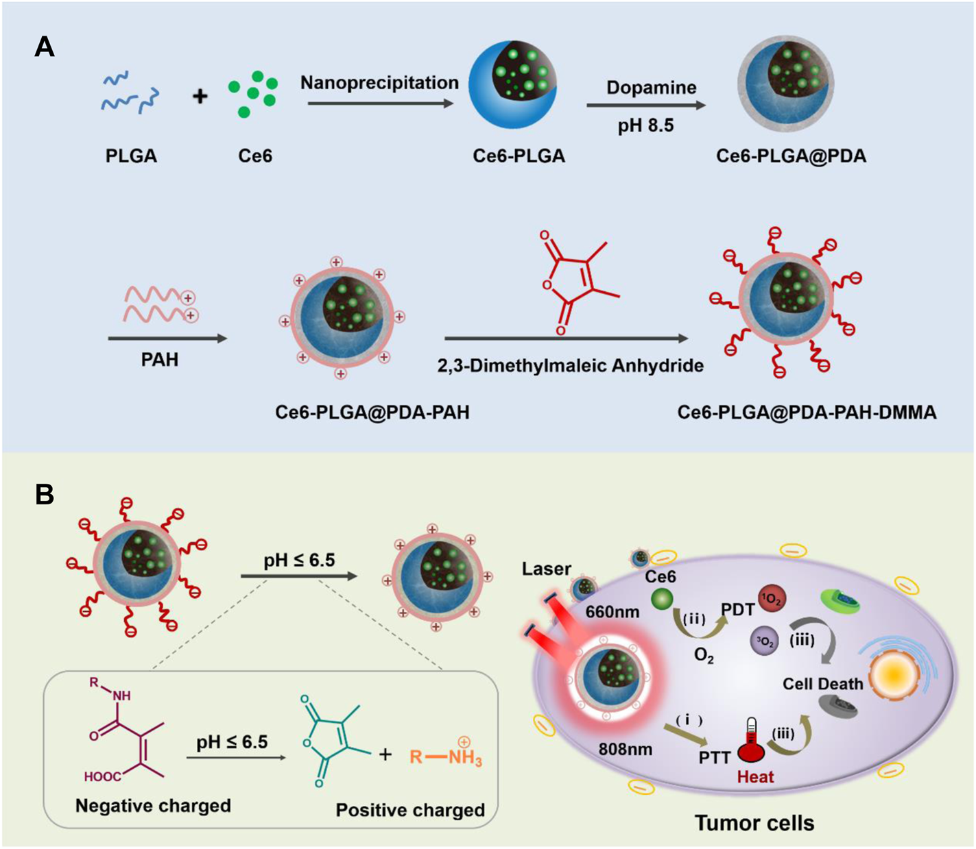 (A) Schematic diagram of the preparation progress of Ce6-PLGA@PDA-PAH-DMMA NPs. (B) Ce6-PLGA@PDA-PAH-DMMA NPs applied to PTT/PDT synergistic breast cancer therapy.