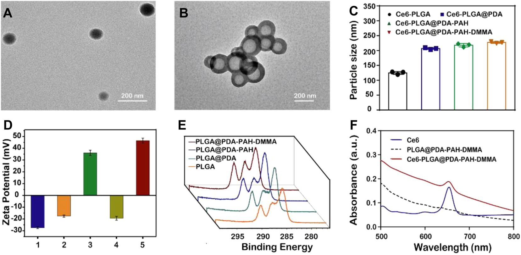Characterization of the synthesized NPs. TEM images of (A) Ce6-PLGA NPs; (B) Ce6-PLGA@PDA-PAH-DMMA NPs. (C) Particle size of synthesized NPs. (D) Surface zeta potentials of different NPs (1, 2, 3, 4, and 5 present Ce6-PLGA NPs, Ce6-PLGA@PDA NPs, Ce6-PLGA@PDA-PAH NPs, Ce6-PLGA@PDA-PAH-DMMA NPs-pH 7.4, and Ce6-PLGA@PDA-PAH-DMMA NPs-pH 5.5). (E) XPS spectra of PLGA NPs, PLGA@PDA NPs, PLGA@PDA-PAH NPs, and PLGA@PDA-PAH-DMMA NPs. (F) UV-vis spectra of Ce6, PLGA@PDA-PAH-DMMA NPs, and Ce6-PLGA@PDA-PAH-DMMA NPs.