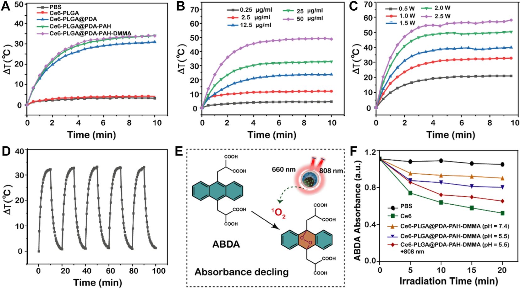 Photothermal properties. (A) Heating curves of different NPs after irradiating by the 808-nm laser. (B) Photothermal heating curves of different concentrations of Ce6-PLGA@PDA-PAH-DMMA NPs irradiated by the 808-nm laser (1.5 W/cm2, 10 min). (C) Temperature changes of Ce6-PLGA@PDA-PAH-DMMA NPs exposed to the 808-nm laser in different power densities. (D) Heating/cooling curves for 10 min-on–10 min-off laser irradiations (808 nm, 1.5 W/cm2, 5 times). (E) Detection mechanism of ABDA for 1O2. (F) Absorption spectra of ABDA for 1O2 generation in different formulations treated in different ways.