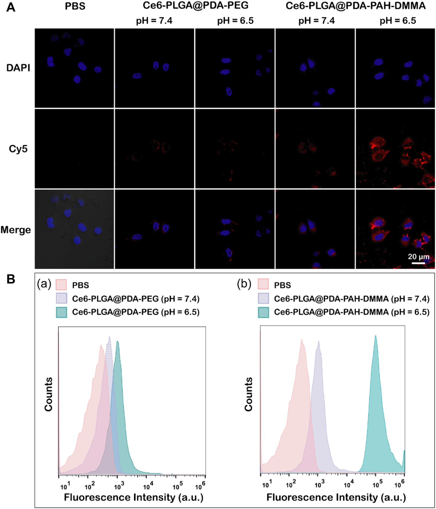 (A) Confocal images of MCF-7 cells cultured separately with the NPs at pH 7.4 and 6.5 for 2 h at 37°C (Blue: DAPI; Red: Cy5 fluorescence). (B) Flow cytometric analysis of MCF-7 cells after treating with Ce6-PLGA@PDA-PEG NPs (A) and Ce6-PLGA@PDA-PAH-DMMA NPs (B) at pH 7.4 and 6.5.