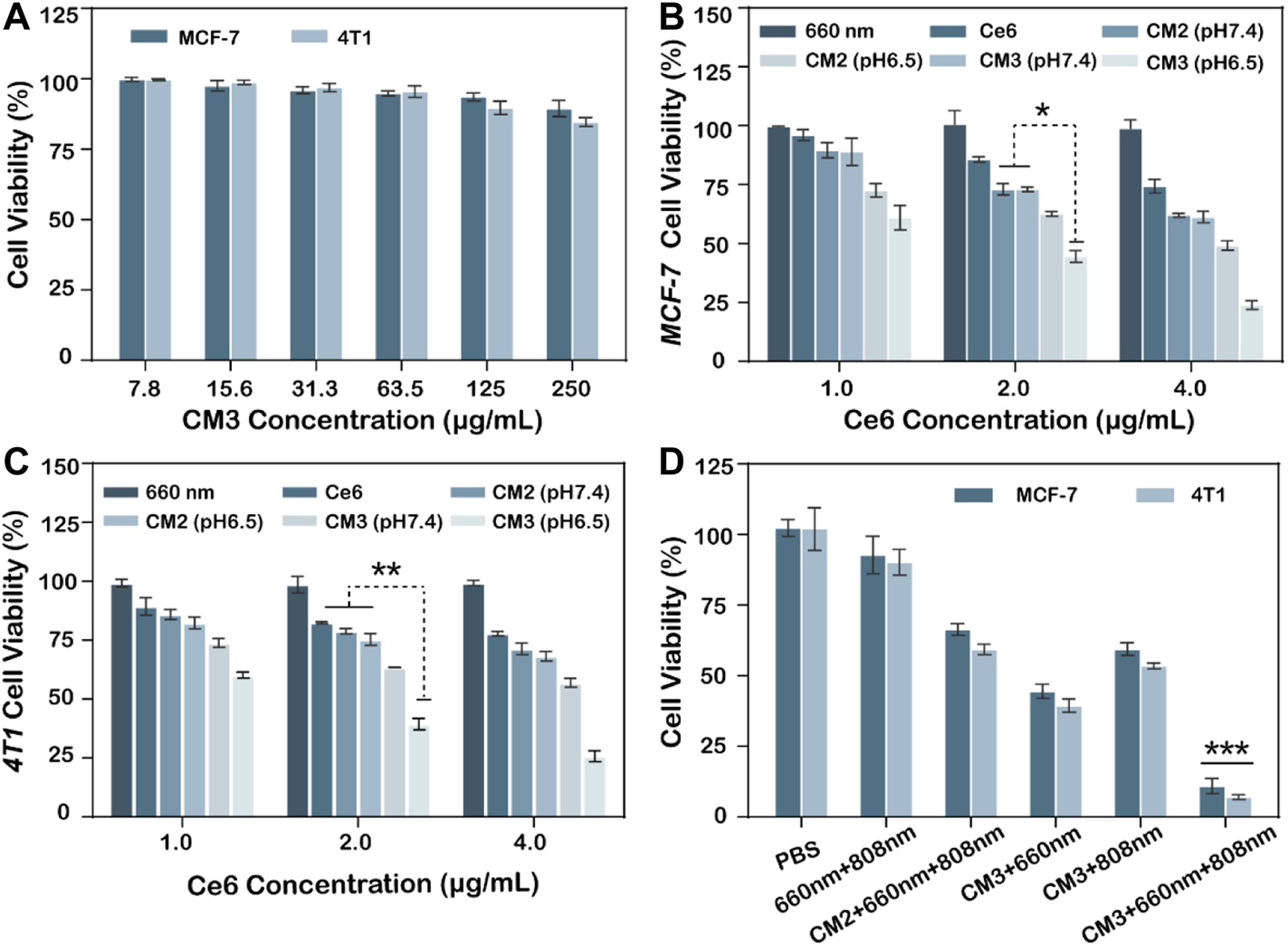 (A) Viability of MCF-7, 4T1 cells after treating with different concentrations of Ce6-PLGA@PDA-PAH-DMMA (CM3) without lasers. Viability of MCF-7 cells (B) and 4T1 cells (C) after incubation with Ce6-PLGA@PDA-PEG NPs (CM2) and Ce6-PLGA@PDA-PAH-DMMA NPs (CM3) at concentrations of Ce6 (1.0 μg/ml, 2.0 μg/ml, and 4.0 μg/ml) under the 660-nm laser irradiation (200 mW/cm2, 5 min) at pH 6.5. (D) Viability of cancer cells after PTT or PDT alone and PTT/PDT treatments (t-test, *p < 0.05, **p < 0.01, ***p < 0.001 and n = 3); Q value method: Q = V (a + b)/(Va + Vb—Va* Vb). V (a + b) is the inhibition rate of combined A and B drug, Va and Vb are the A and B drugs alone (Q < 0.85 is antagonism, 0.85 ≤ Q < 1.15 is additive, and Q ≥ 1.15 is synergy).