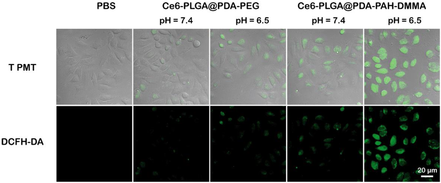 Confocal images of ROS generation by cells treated with PBS (control), Ce6-PLGA@PDA-PEG NPs, and Ce6-PLGA@PDA-PAH-DMMA NPs.