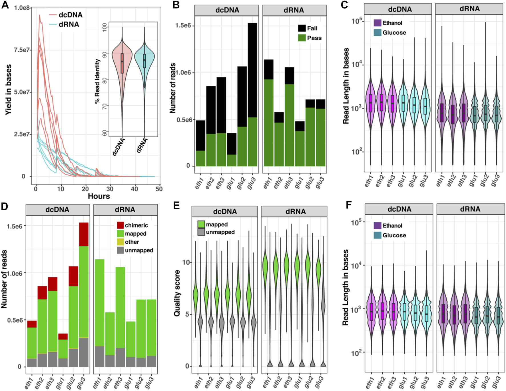 FIGURE 2. Comparison of read characteristics for six datasets of yeast RNA sequenced as dcDNA or dRNA. (A) Sequence yields per hour and violin boxplot of %read identity; (B) numbers of reads that passed (green) or failed (black) the quality score of 7 by Guppy software; (C) read length distribution of all reads combined (passed plus failed); (D) numbers of all reads that could be mapped to a reference genome; (E) quality score distribution of mapped and unmapped reads; and (F) read length distribution of the reads after removal of chimeric sequences. Data are shown for glucose-grown cells (glu) and for glucose-deprived cells (eth).