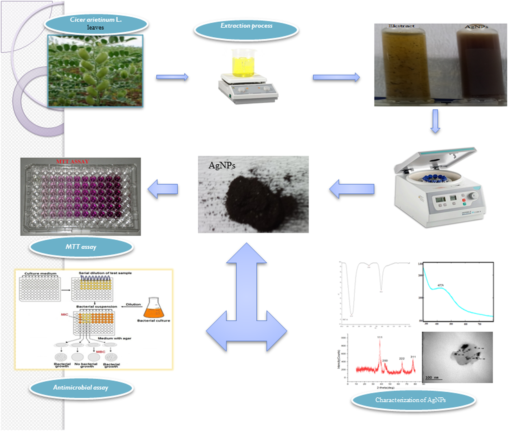 In this study considering the properties of plants, the synthesis and stabilization of silver nanoparticles were achieved by reducing Ag metal salt by using chickpea (Cicer arietinum L.) (CA) leaf extract. Plant-based synthesized AgNPs were investigated for their effectiveness against pathogens, microorganisms, and cancerous and healthy cell lines (Figure 1).