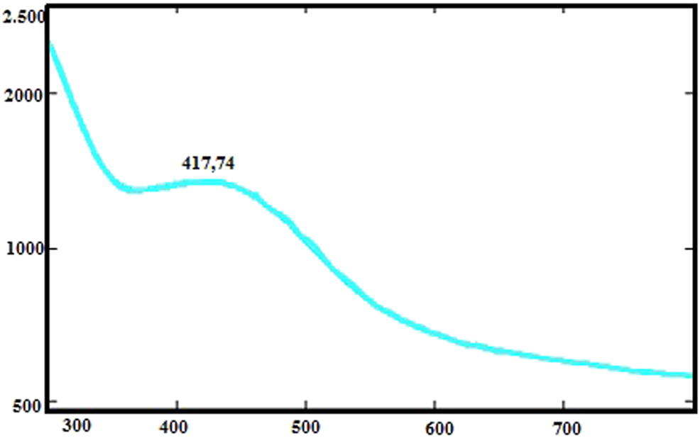 The color change was observed after the CA leaf extracts with AgNO3 solution were left to react in a container. The UV-vis spectrum of AgNPs appeared to change from light green to purple (Figure 2). Because of the surface plasmon resonance, AgNPs gave a peak at a specific absorbance value of about 417.47 nm. Similarly, some researchers reported that the absorption spectrum of AgNPs is between 425–461 nm (Udayasoorian et al., 2011).