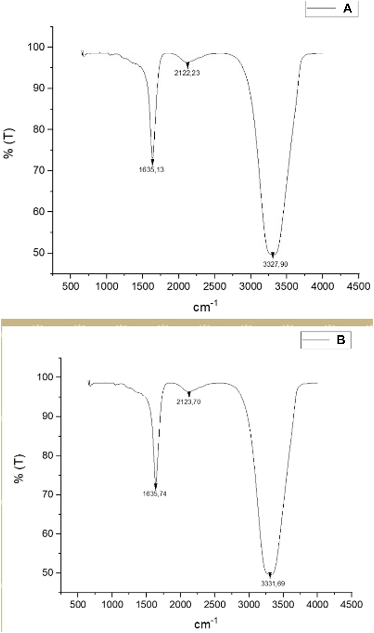 The FT-IR spectroscopy analysis determined the functional groups involved in the plant-derived reduction. The frequency of all stretch in the range of 4500–500 cm−1 was recorded with four scans at 1 cm−1 resolution. Figure 4 shows a comparison of FT-IR spectra for the aqueous CA extract (Figure 5A) and synthesized AgNPs (Figure 5B). When the biomolecules involved in reduction during the formation of AgNPs were examined (Figures 5A,B), the absorption peak at 1635 cm−1 corresponded to the C=O stretching vibration, indicating the presence of amide. Because of the phenolic compounds in the CA leaf extract, it can be concluded that the absorption peak at 2122 cm−1 belongs to alkyne (C≡C) groups while the absorption peak at 3331 cm-1 belongs to O-H and N-H stretching (Atalar et al., 2021). Presumably, these determined functional groups are responsible for the reduction of metal ions (Mandal et al., 2015).