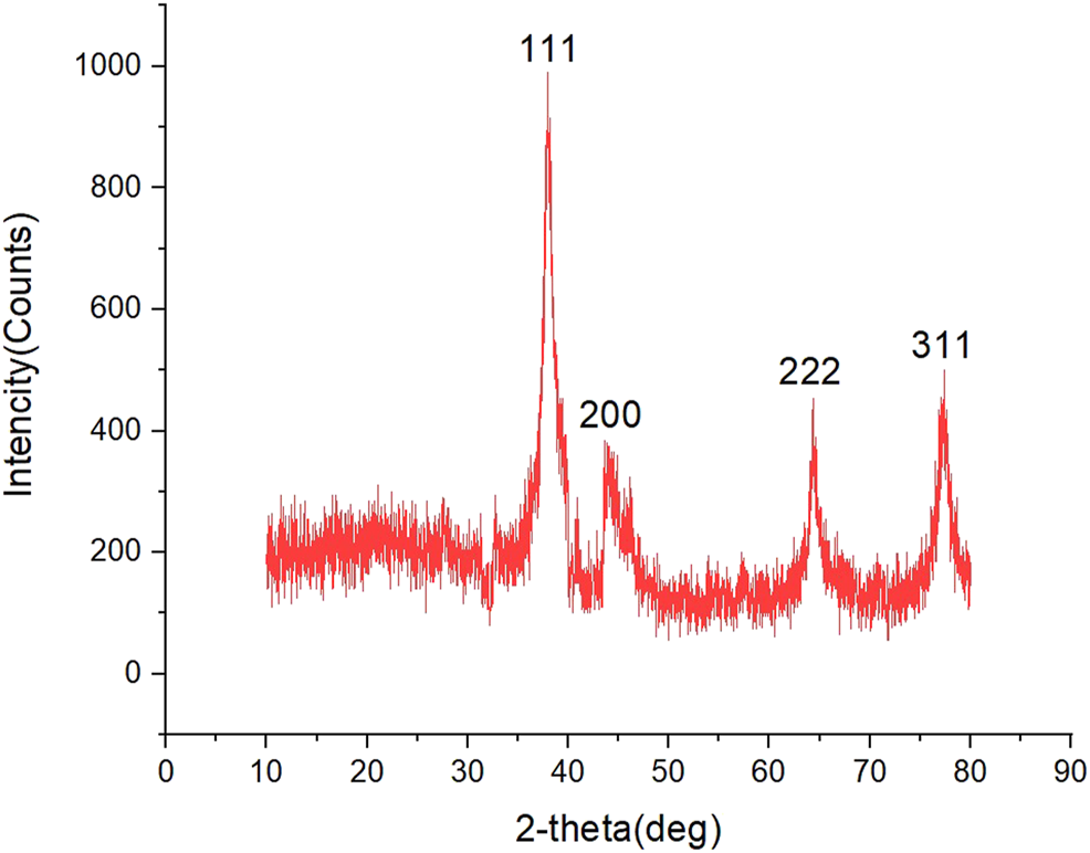 The XRD spectrum model for the synthesized AgNPs is shown in Figure 7. In XRD analysis results, peaks of 111o, 200o, 220o, and 311o, which coincide with 37.96, 44.29, 64.32, and 77.33, respectively at 2θ, were sharp peaks representing the spherical crystal structure of silver. The peaks indicated that the AgNPs were cubic in structure. It has been reported in many studies that these peaks belong to silver (Huang et al., 2019; Keskin et al., 2021). The highest peak, 37.96, was taken as the peak angle. The size of the nanomaterials was calculated as approximately 12.17 nm according to the below equation ((Baran et al., 2021a).