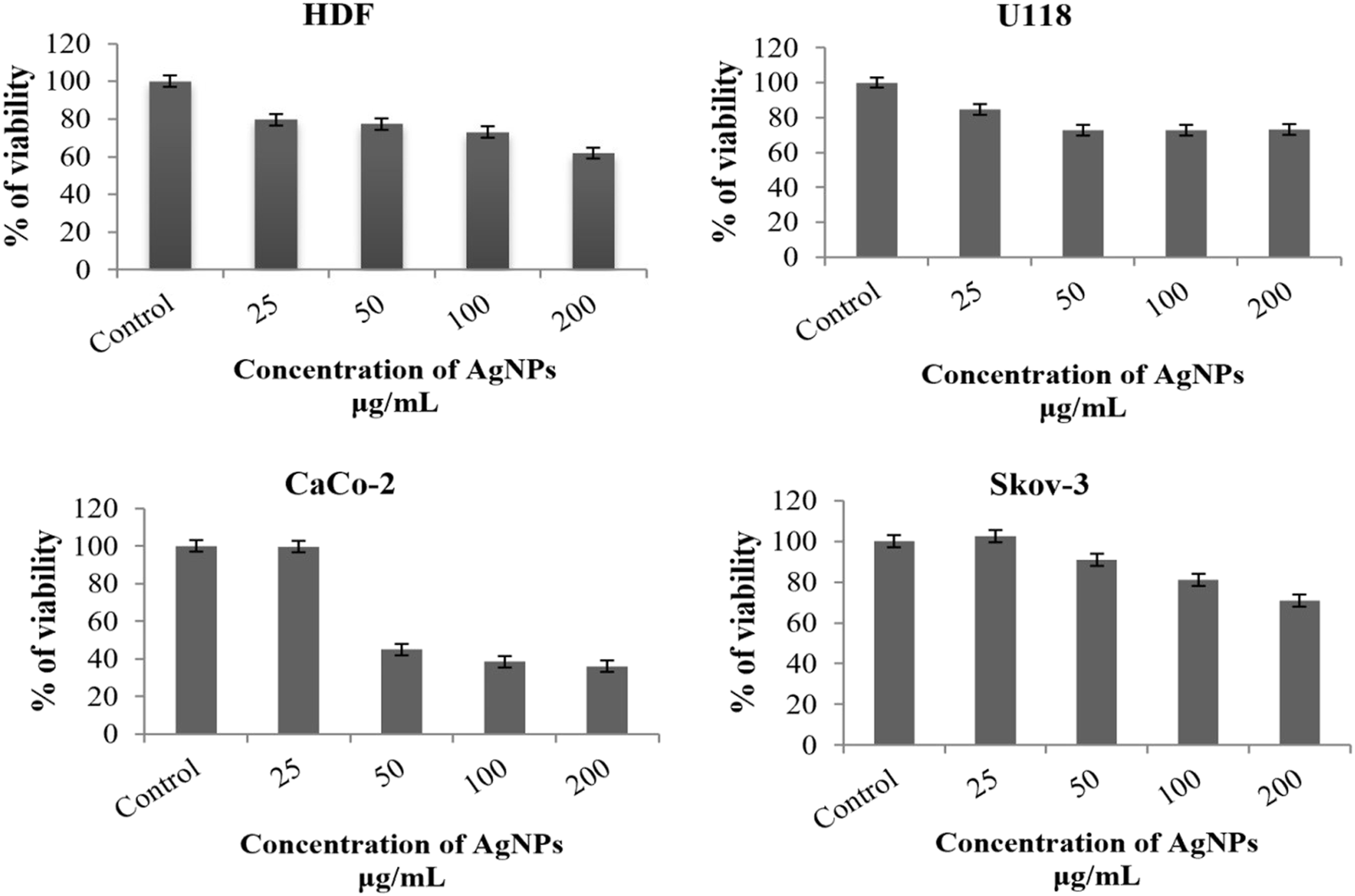 The MTT method was performed to determine the plant-based AgNP ratio of cytotoxicity (viability suppressor) on cancerous and healthy cell cultures. T-75 T-flasks were used to prepare the culture medium. CaCo-2, HDF, and U118 cell lines were cultivated in DMEM solution. The human ovarian cancer cell line (SK-OV-3) was incubated in RPMI solution. Prepared cultures were incubated at 5% CO2, 37°C, and 95% air and humidity conditions. When the cells reached about 80% confluency in the hemocytometer measurement, cell cultures were suspended at different concentrations and transferred to microplates (96-well) for incubation (overnight). At the end of the period, the cultured cell lines were treated with nanoparticles at different concentrations (25, 50, 100, and 200 μg/ml) and incubated for 2 days. In the next step, the MTT solution was transferred to the microplate wells and incubated for 3 h, and then DMSO was added and kept at room temperature for 0.25 h. The absorbance (540 nm) of the microplates was measured with MultiScan Go (Thermo).