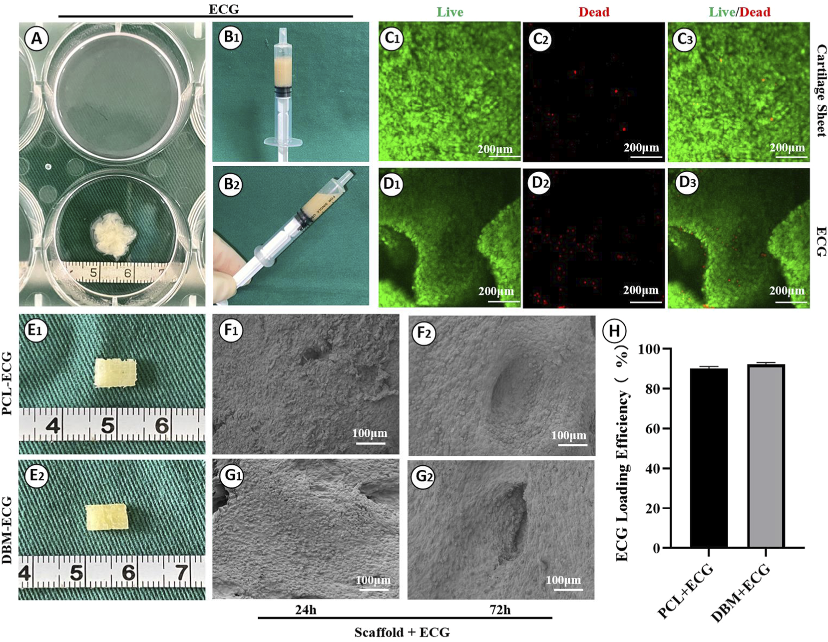 FIGURE 2. Preparation of engineered cartilage gel and its biocompatibility with the frameworks: Gross images of cartilage sheet (A) and ECG (B1, B2); Live/dead staining of cartilage sheet (C1–C3) and ECG (D1–D3); Gross images of the PCL-ECG (E1) and DBM-ECG (E2) constructs; SEM images of PCL-ECG (F1, F2) and DBM-ECG (G1, G2) constructs after culture in vitro for 24 h and 72 h; (H) ECG loading efficiency. Statistical significance: ns, no statistical significance.