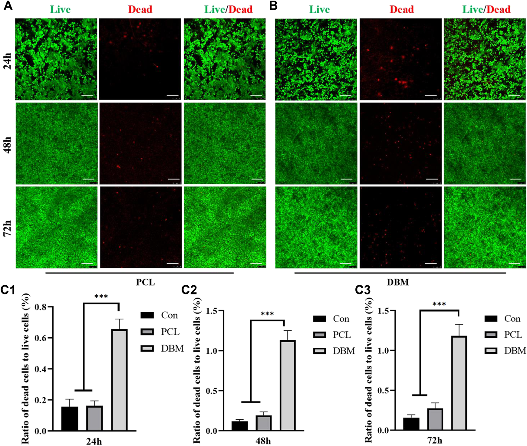FIGURE 3. Cytotoxicity evaluation of the frameworks to ECG. (A) Live/dead staining of ECG in PCL leach solution for 24, 48, and 72 h; (B) Live/dead staining of ECG in DBM leach solution for 24, 48, and 72 h; Semi-quantitative analysis for the ratio of dead cells to live cells at 24h (C1), 48h (C2), and 72h (C3). Statistical significance: ∗∗∗p < 0.001. Scale bar: 100μm.