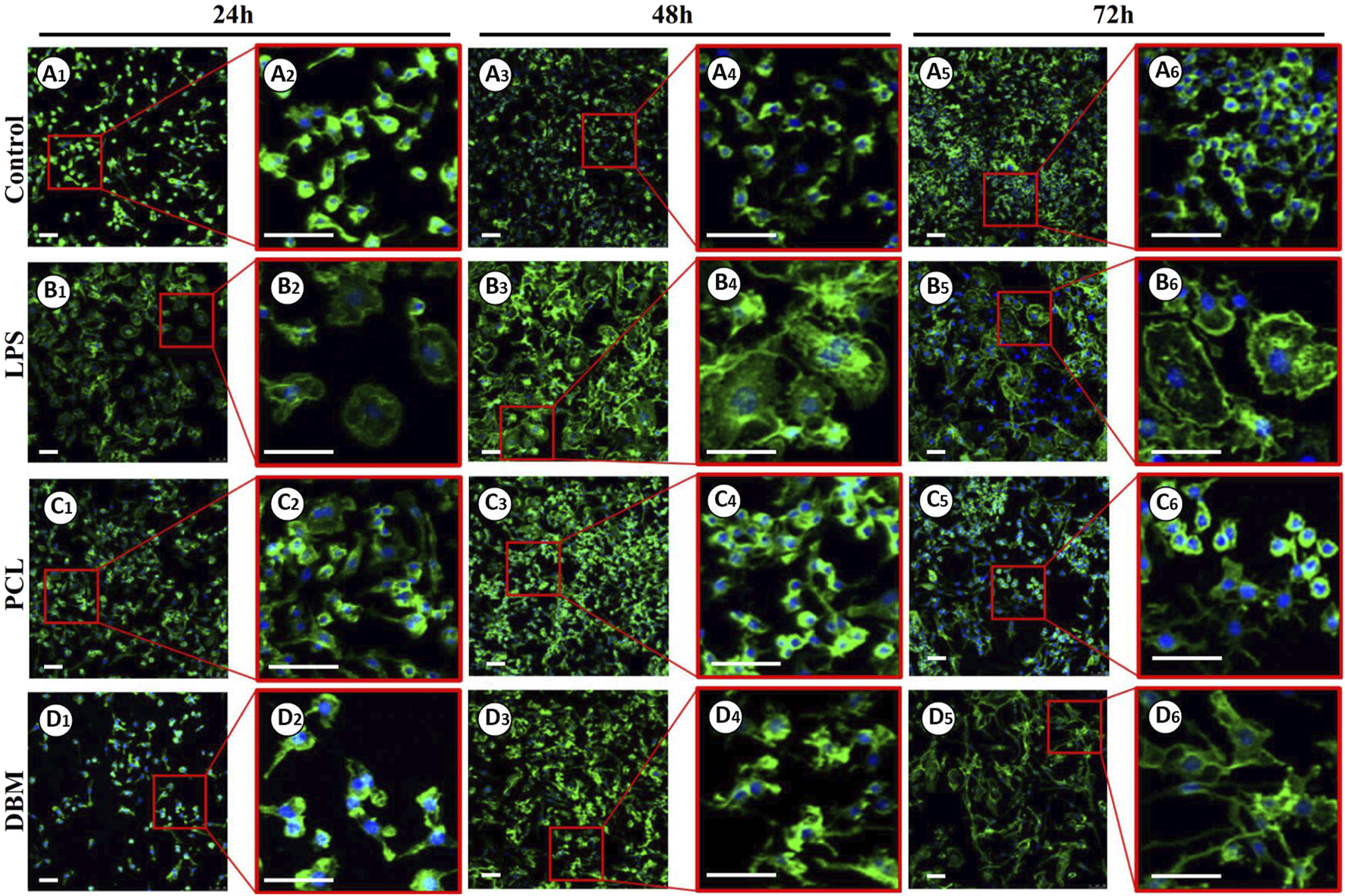 FIGURE 6. Phalloidine immunofluorescence staining of RAW 264.7 cells treated by leach solutions of PCL and DBM frameworks: Negative control cultured in DMEM (A1–A6); Positive control activated by LPS (B1–B6); RAW 264.7 cells treated by PCL leach solution (C1–C6); RAW 264.7 cells treated by DBM leach solution (D1–D6). Scale bar: 100 μm.