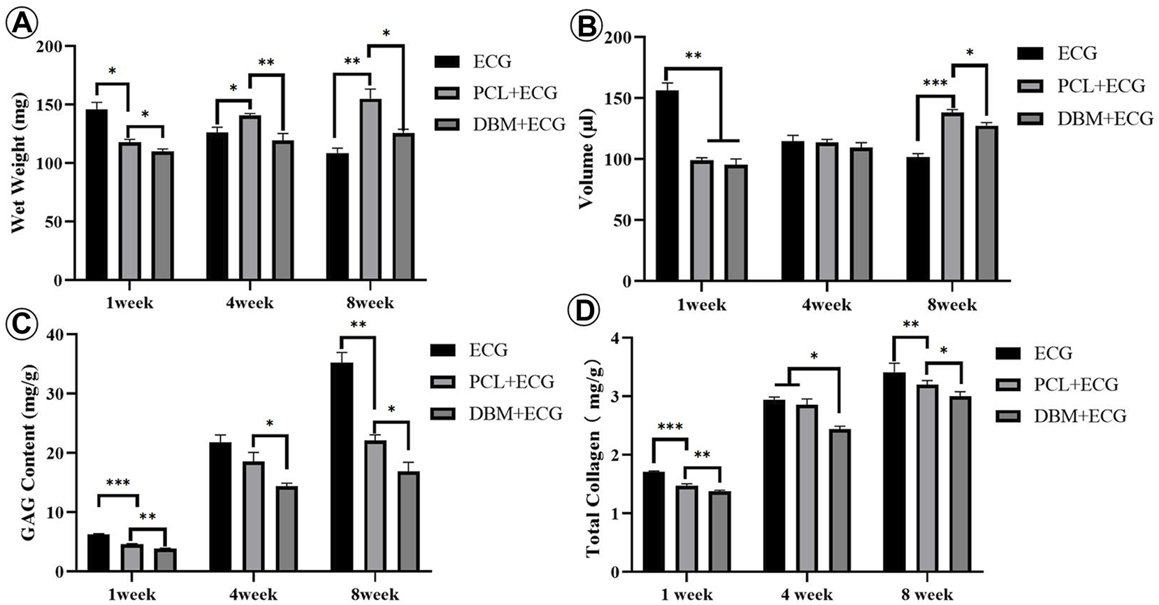 FIGURE 9. Quantitative evaluations of the regenerated cartilage in ECG, PCL-ECG, and DBM-ECG groups after 1, 4, and 8 weeks of subcutaneous implantation: (A) wet weight, (B) volume, (C) total glycosaminoglycan (GAG) content, and (D) total collagen content. Statistical significance: ∗p < 0.05, ∗∗p < 0.01, ∗∗∗p < 0.001.