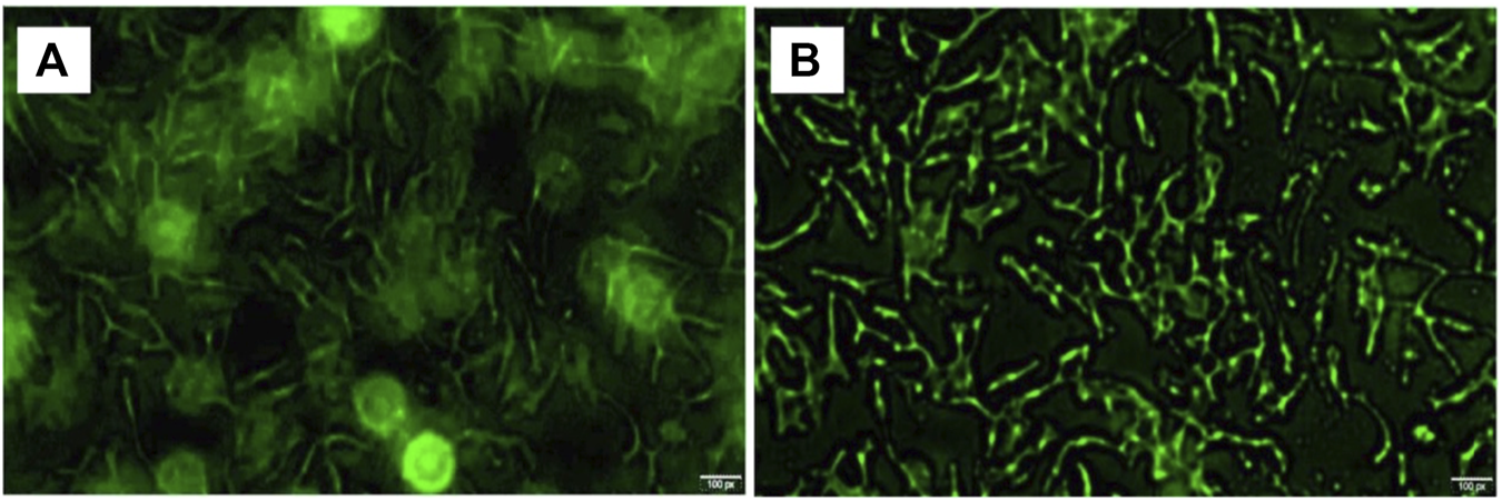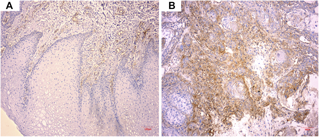 CD59 expression in oral squamous cancer cells. (A) Low expression of CD59 in normal oral keratinocytes. (B) High expression of CD59 in oral squamous carcinoma cells.