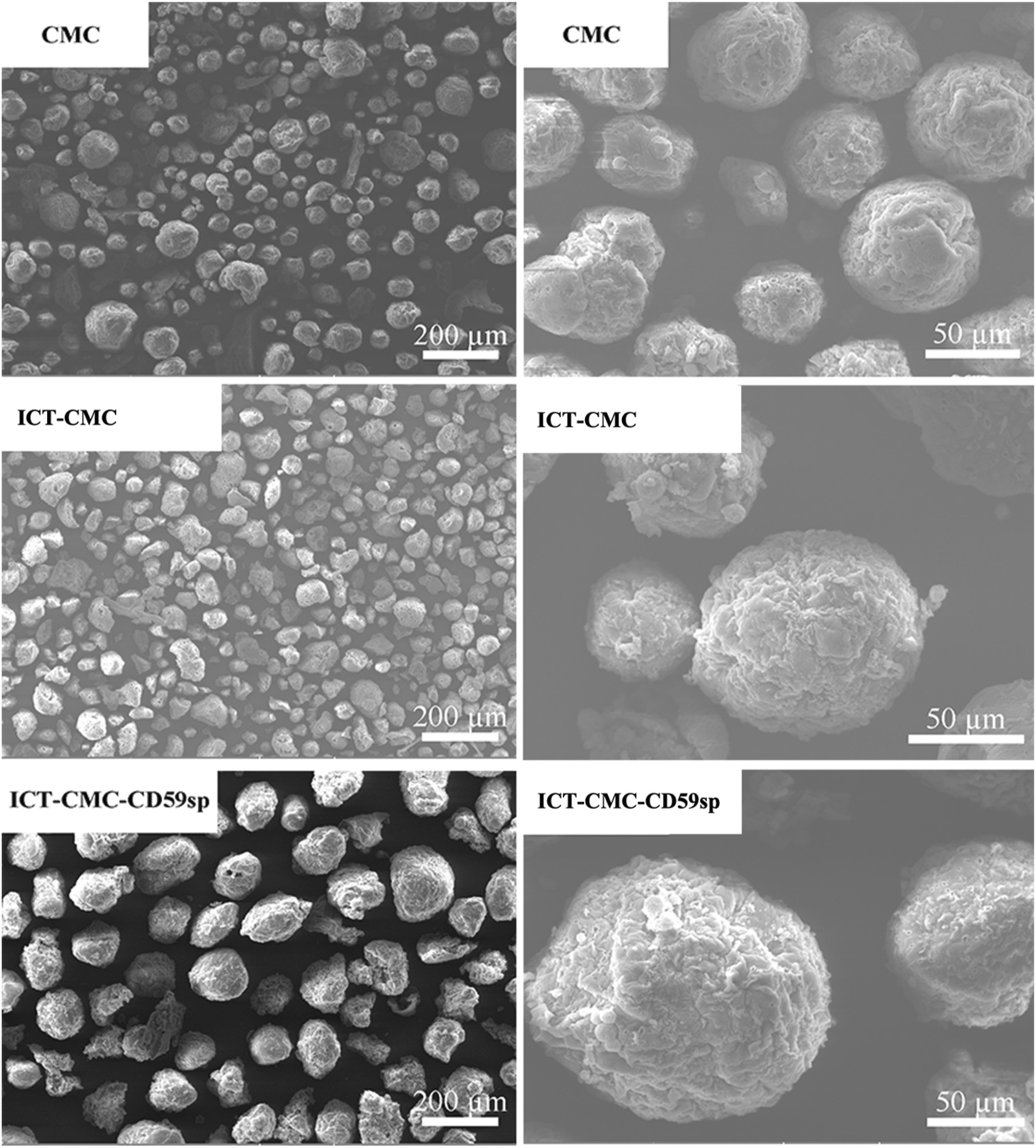 Images of CMC, ICT-CMC, and ICT-CMC-CD59sp microspheres.
