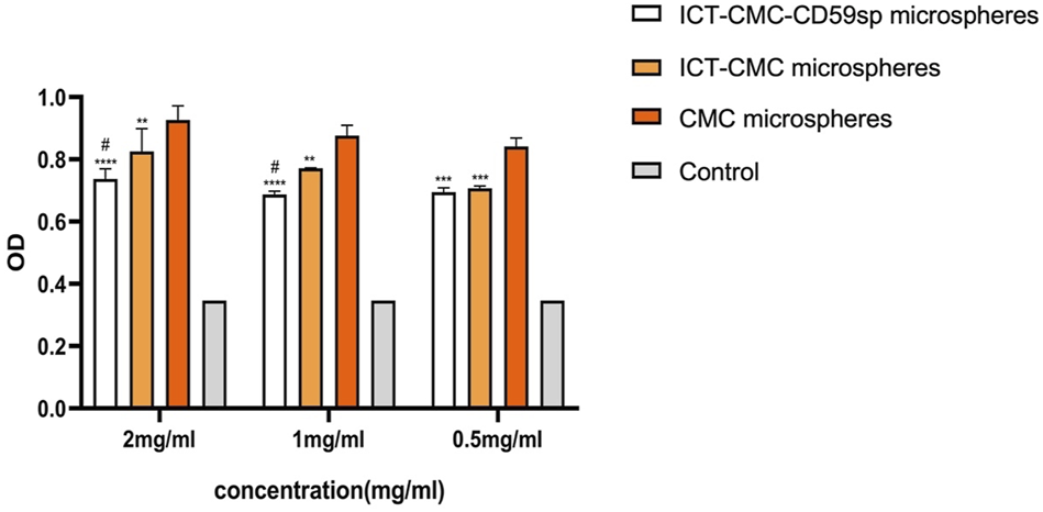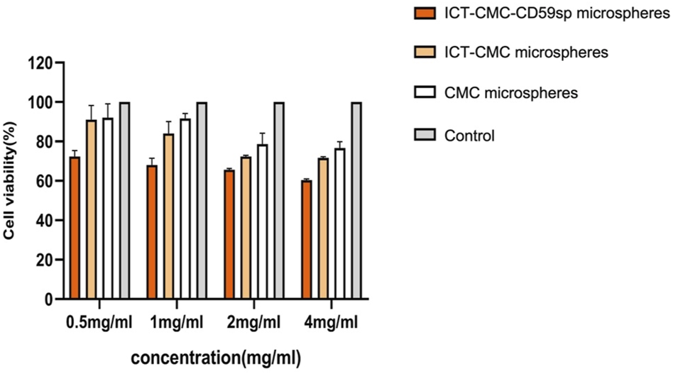 Cell experiments were divided into three groups: the CMC microsphere group, the ICT-CMC microsphere group, and the ICT-CMC-CD59sp microsphere group. The microsphere concentrations of each group in this part were 2 mg/ml, 1 mg/ml, and 0.5 mg/ml, respectively.