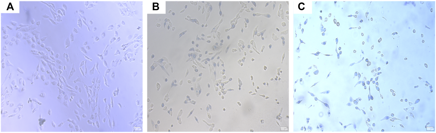 OSCC trypan blue staining. (A) CMC microsphere group, (B) ICT-CMC microsphere group, and (C) ICT-CMC-CD59sp microsphere group.
