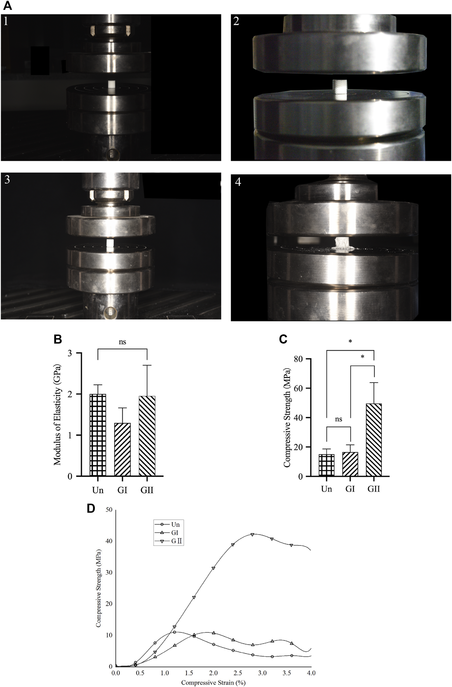FIGURE 2. Compression test of porous scaffolds. (A) The process of compression testing. (B) The elastic modulus of porous scaffolds. (C) The compression strength of porous scaffolds. (D) Stress strain relationship of porous scaffolds.