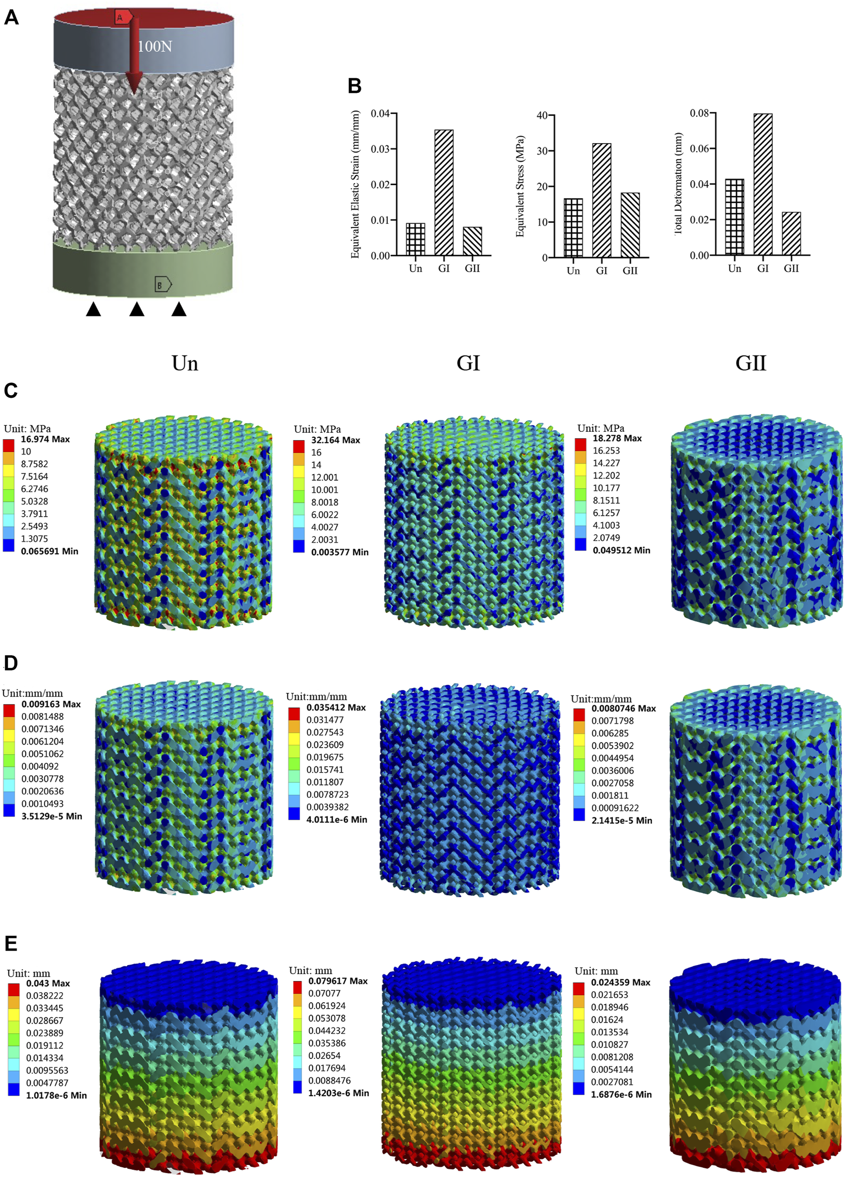 The compression test showed that there was no significant difference in the elastic modulus of the three groups (Figure 2B), and the GII scaffolds had better compressive strength than the other groups (p < 0.05) (Figure 2C), as illustrated by stress strain graphs (Figure 2D). Finite element analysis (FEA) was carried out by using the Ansys Workbench program (Ansys, United States) under the following boundary conditions: fixation for the bottom surface was fixed, and then a force of 100 N was applied at the surface (Figure 3A). The data showed that the peak equivalent stress of the Un (16.973 MPa) and the GII (18.278 MPa) were lower, the equivalent elastic strain was smaller, the total displacement after being subjected to pressure of the GII was the smallest, and there was no obvious stress concentration area. The stress concentration of the Un was significant and distributed in the cross section. Likewise, the equivalent elastic strains of the Un (0.009163 mm/mm) and the GII (0.0080746 mm/mm) were smaller than that of the GI (0.035412 mm/mm), and the displacement of the GII (0.024359 mm) was smaller than that of the Un (0.043000 mm) and the GI (0.079617 mm). Then we continued to verify its mechanical properties through compression tests, and the results were consistent with FEA results. There was no significant difference between the elastic modulus of the Un and the GII, and the GI was lowest among the three groups. However, the compressive strength and peak stress of the GII group were significantly higher than those of the other two groups.