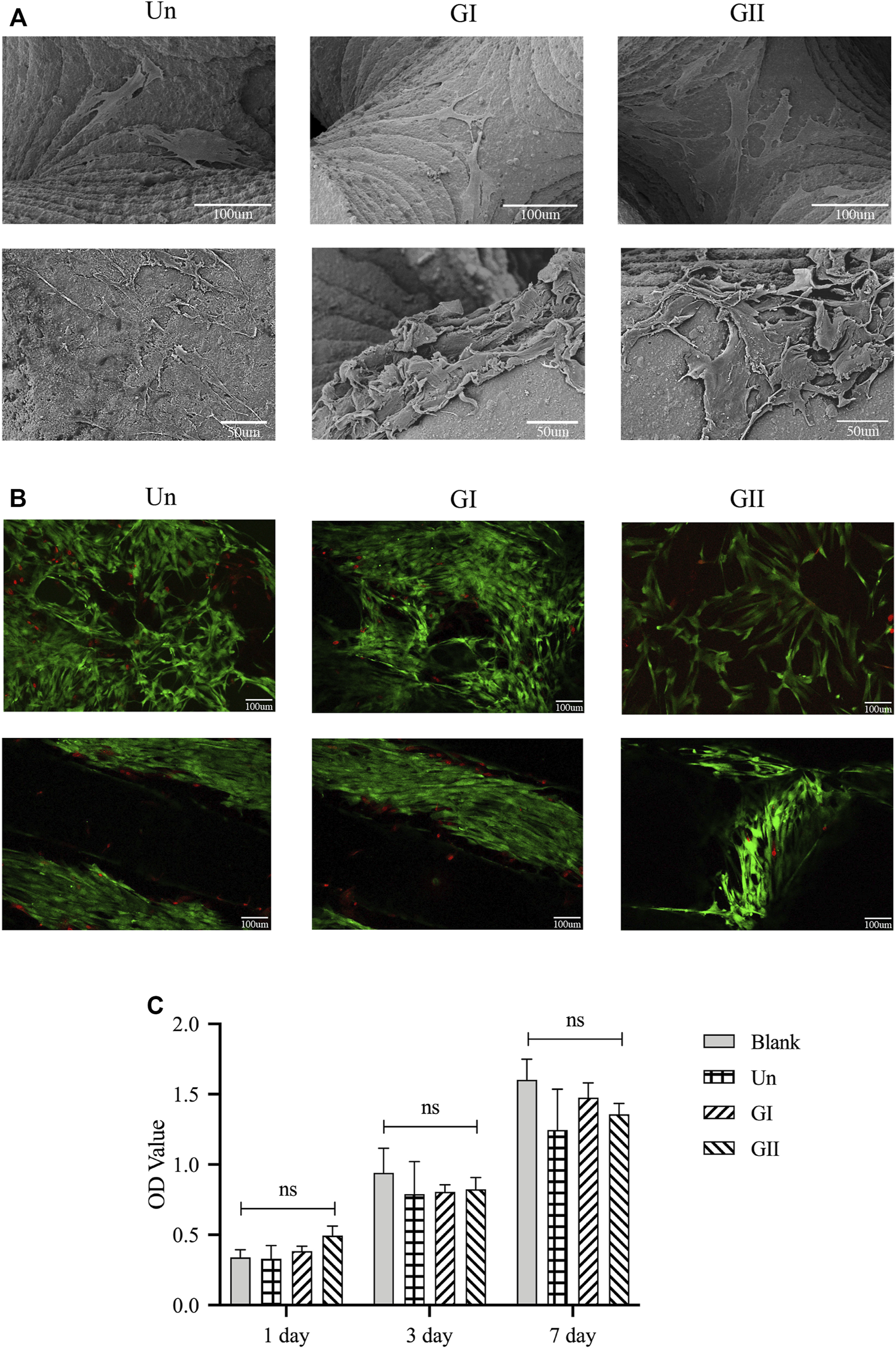 SEM images showed the rBMSCs morphology on the porous scaffolds after 3 and 7 days of culture growth (Figure 5A). The cells adhered and proliferated on the surface of the scaffolds. The cell viability on the porous scaffolds was evaluated by live/dead staining after 3 and 7 days of culture growth. Fewer dead cells (stained red) were observed on the scaffolds. Overall, cells survived on all scaffolds and grew widely, all over the field of view. All of images indicated that all three scaffolds had good cytocompatibility in vitro (Figure 5B). The CCK8 (Figure 5C) demonstrated that there was no significant difference comparing with the blank group at the 1, 3, and 7 days. Cell proliferation was positively correlated with time, as the OD values of all groups increased with time. There was no significant difference among the four groups, which indicated that the material had good cytocompatibility, and different gradient structures had no significant effect on cell proliferation in vitro (p > 0.05).