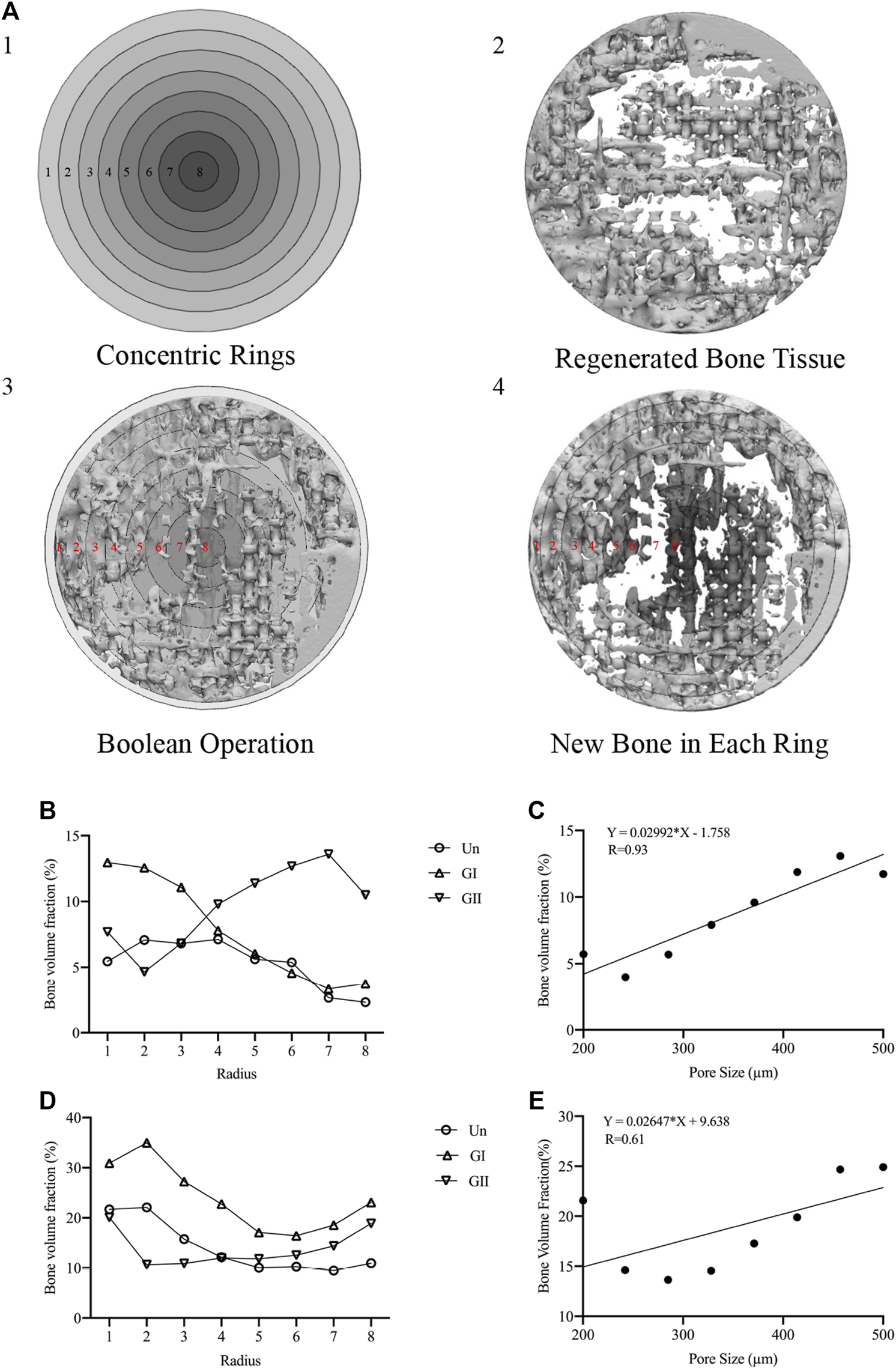 FIGURE 7. Concentric rings analysis. (A-1) Concentric rings designed by 3-Matic software. (A-2) regenerated bone in STL format. (A-3) Boolean operations of A1 and A2. (A-4) New bone in each bone was obtained. (B) New bone of the 8 rings of in rats. (C) Linear regression plots to depict the relationship between pore size and new bone volume in rats. (D) New bone of the 8 rings of in rabbits. (E) Linear regression plots to depict the relationship between pore size and new bone volume in rabbits.