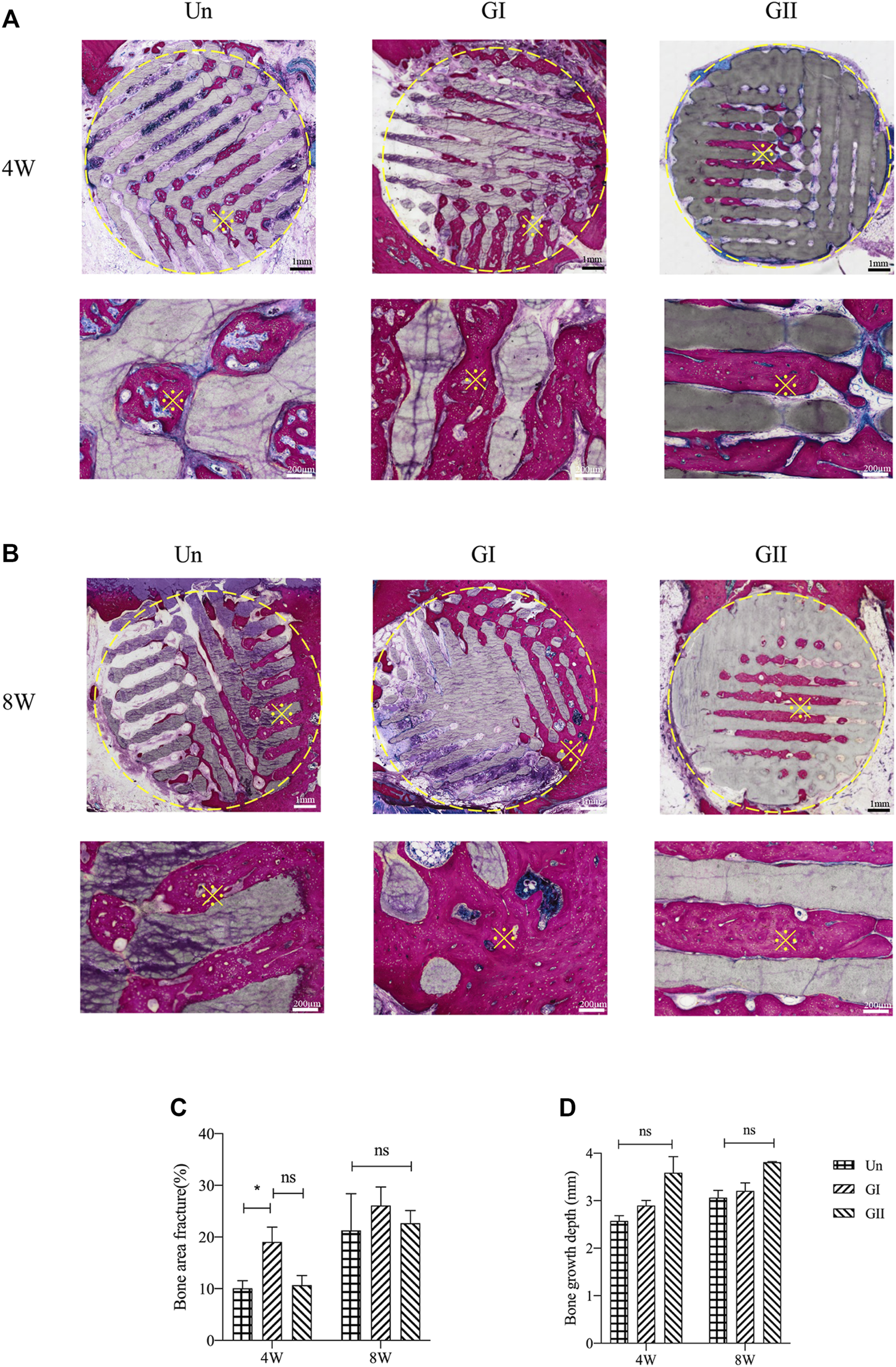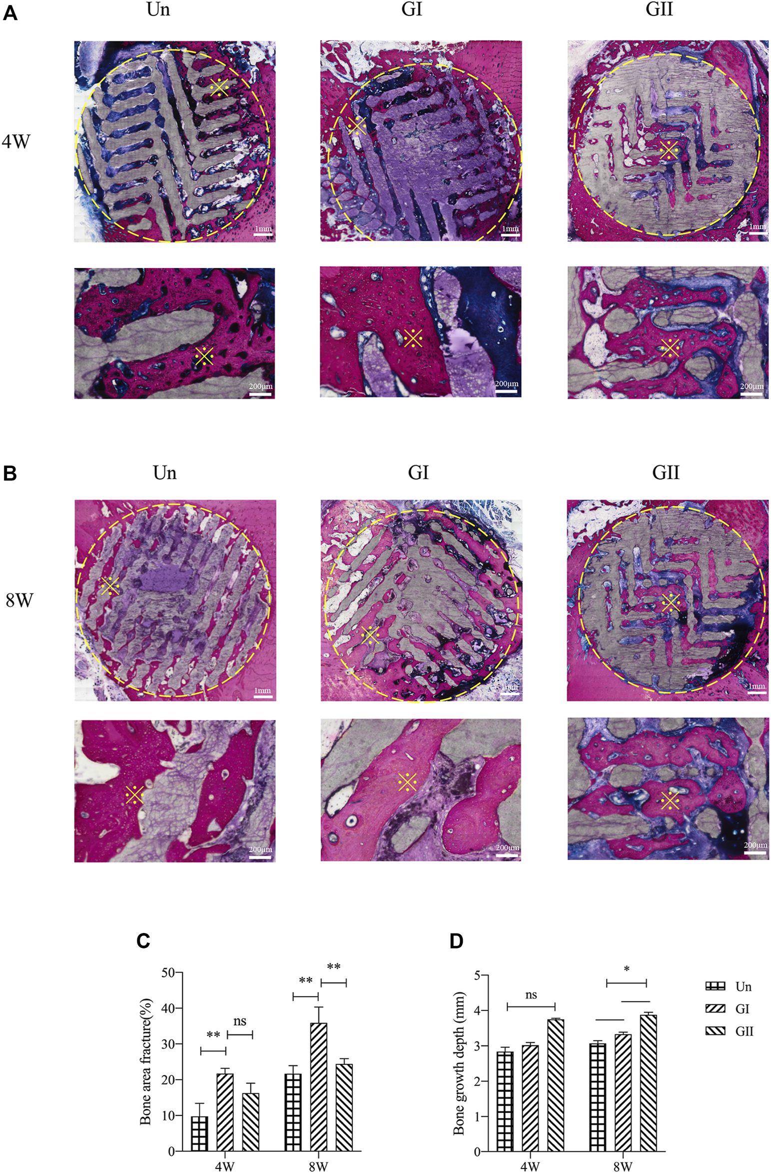 FIGURE 8. Histological analysis of porous scaffolds implanted into rats after 4 weeks (A) and 8 weeks (B), below is a partial enlargement of the figure above, ※with yellow represents locally magnified point. Bone area fraction (C) and bone growth depth from the outer of the scaffold into the center (D).